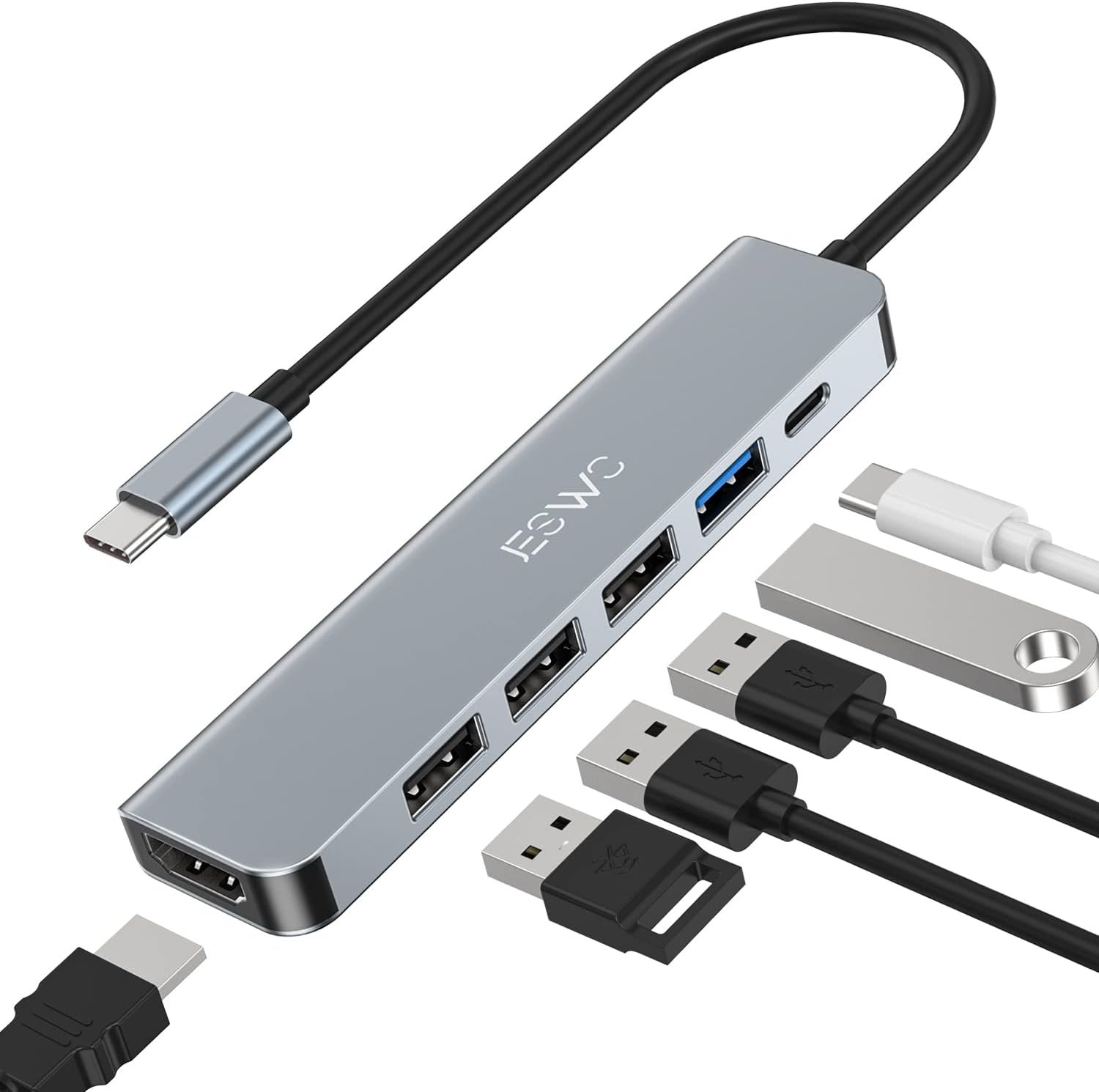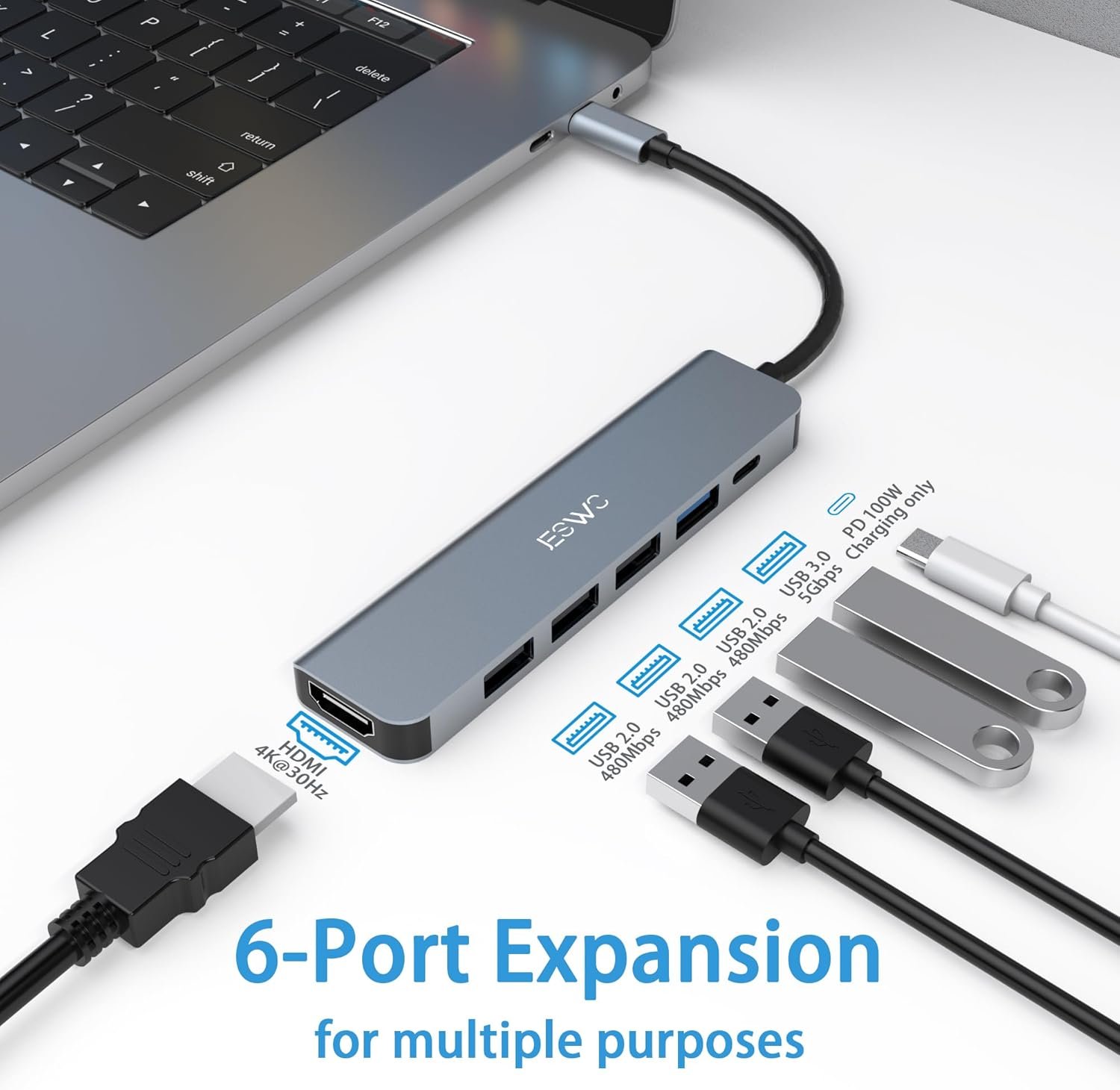 Ce concentrateur USB C 6 en 1 offre une connectivité polyvalente avec un port HDMI 4K, quatre ports USB et un port de charge 100 W. Les ports fonctionnent simultanément pour un usage pratique. La transmission hyper vite atteint 5 Gbit/s via le port USB 3.0, permettant un accès rapide aux fichiers. Les ports USB 2.0 permettent de connecter plusieurs périphériques sans interference.