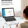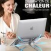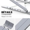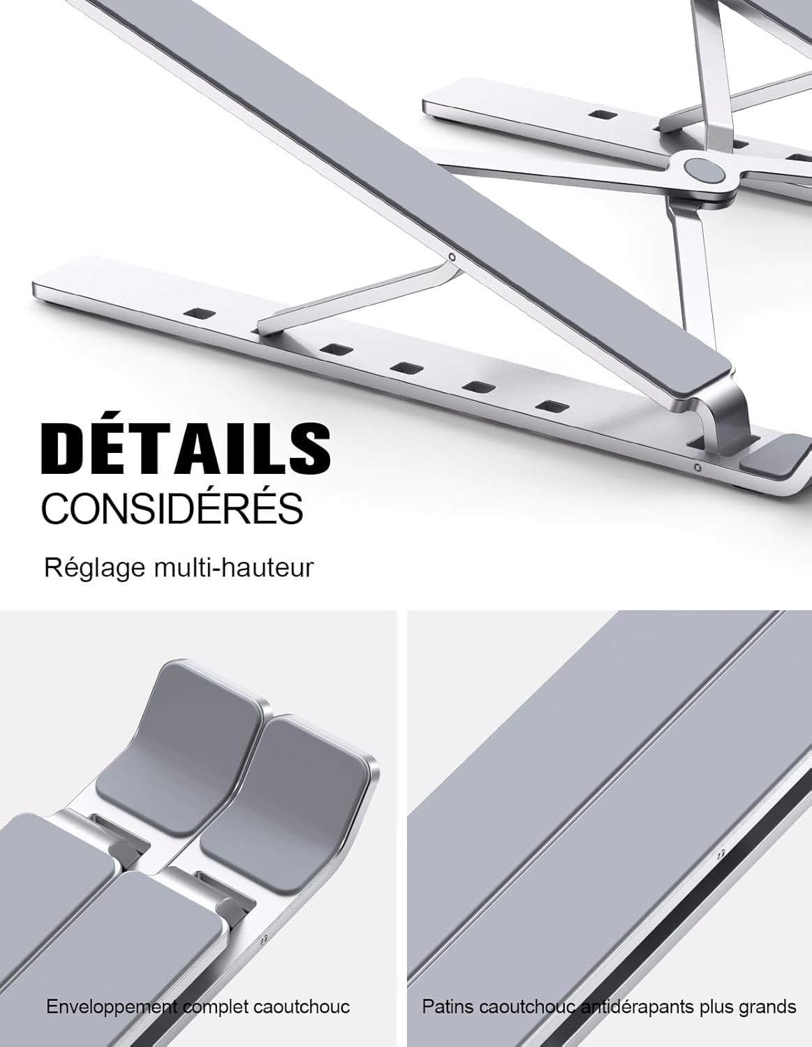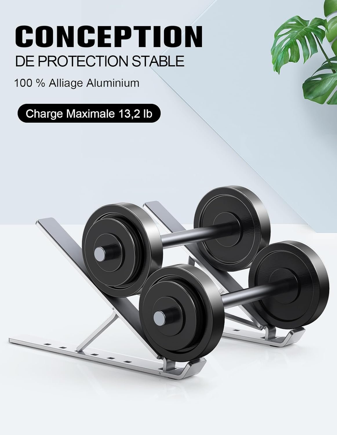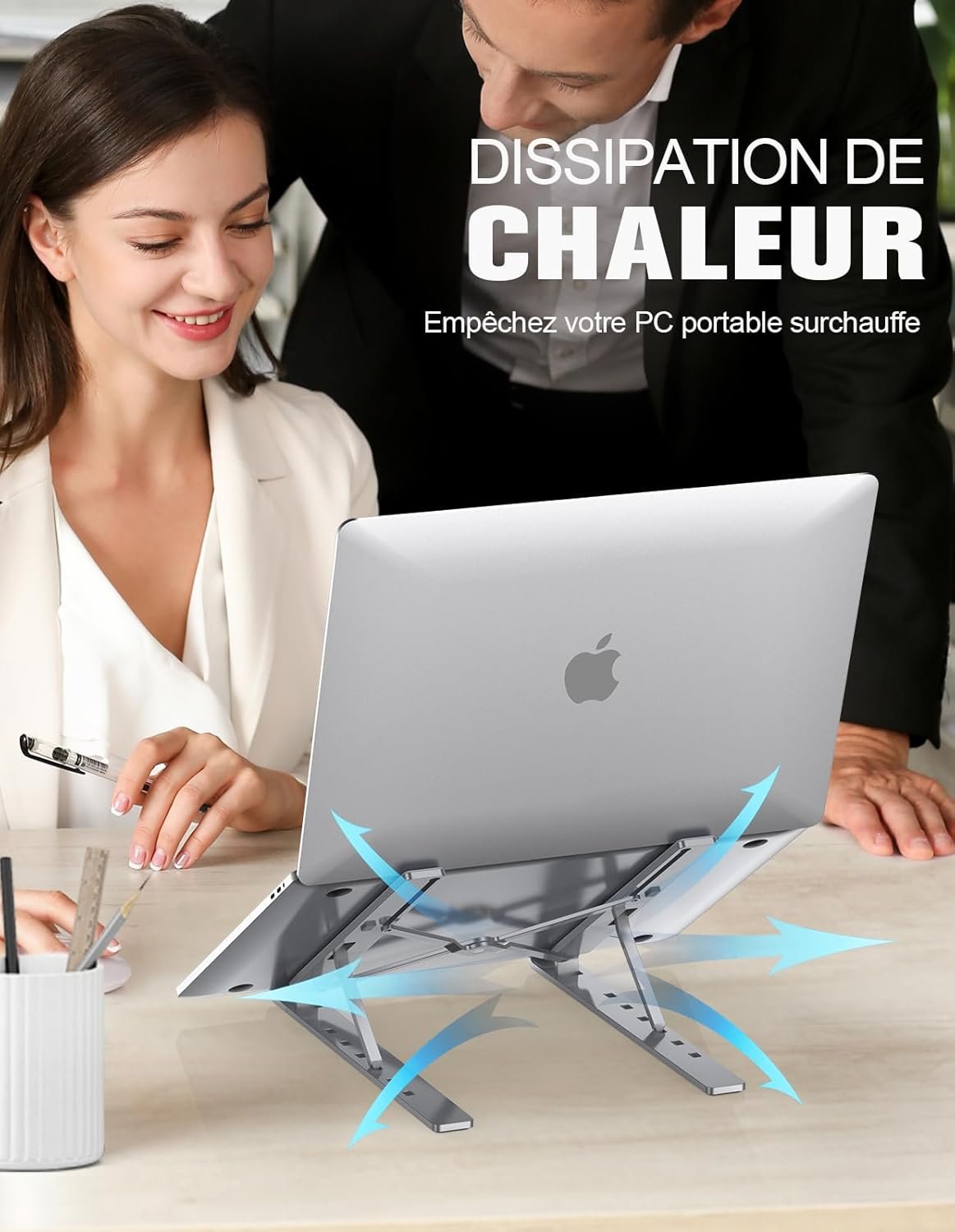 Le support ordinateur portable Babacom est conçu pour offrir une expérience de travail confortable et pratique. Avec ses 5 niveaux de hauteur réglables, vous pouvez ajuster votre ordinateur pour un niveau parfait des yeux, ce qui permet de réduire la fatigue du cou et des yeux. Le support est également robuste et peut supporter jusqu’à 13,2 lb de poids, grâce à son alliage d’aluminium de haute qualité et sa conception triangulaire. Les couvertures en silicone antidérapantes sur les crochets surélevés et la surface supérieure assurent que votre ordinateur reste en place et est protégé contre les rayures et le glissement. De plus, le support est portable et peut être plié rapidement pour un transport facile. Il est compatible avec la plupart des ordinateurs portables et tablettes jusqu’à 15,6 pouces. La conception de refroidissement et de ventilation du support permet de maintenir votre ordinateur à une température stable, prévenant ainsi les surchauffes.
