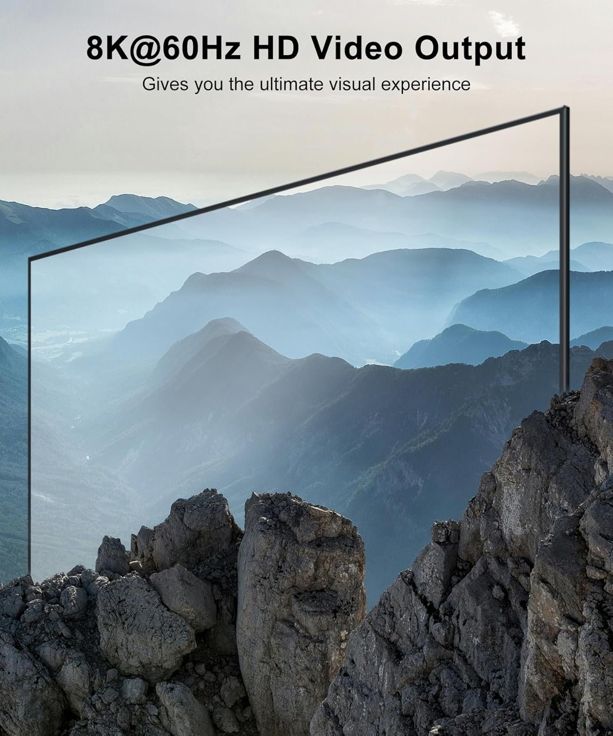 Il prend en charge la résolution 8K@60Hz et l’audio original, parfait pour reproduire votre écran sur un moniteur haute résolution ou profiter de contenus 4K sur deux écrans simultanément. Il est compatible avec de nombreux appareils, notamment les MacBook Pro, les disques durs externes et les batteries externes, et fonctionne avec les technologies USB4, Thunderbolt 5/4/3 et les versions antérieures.
