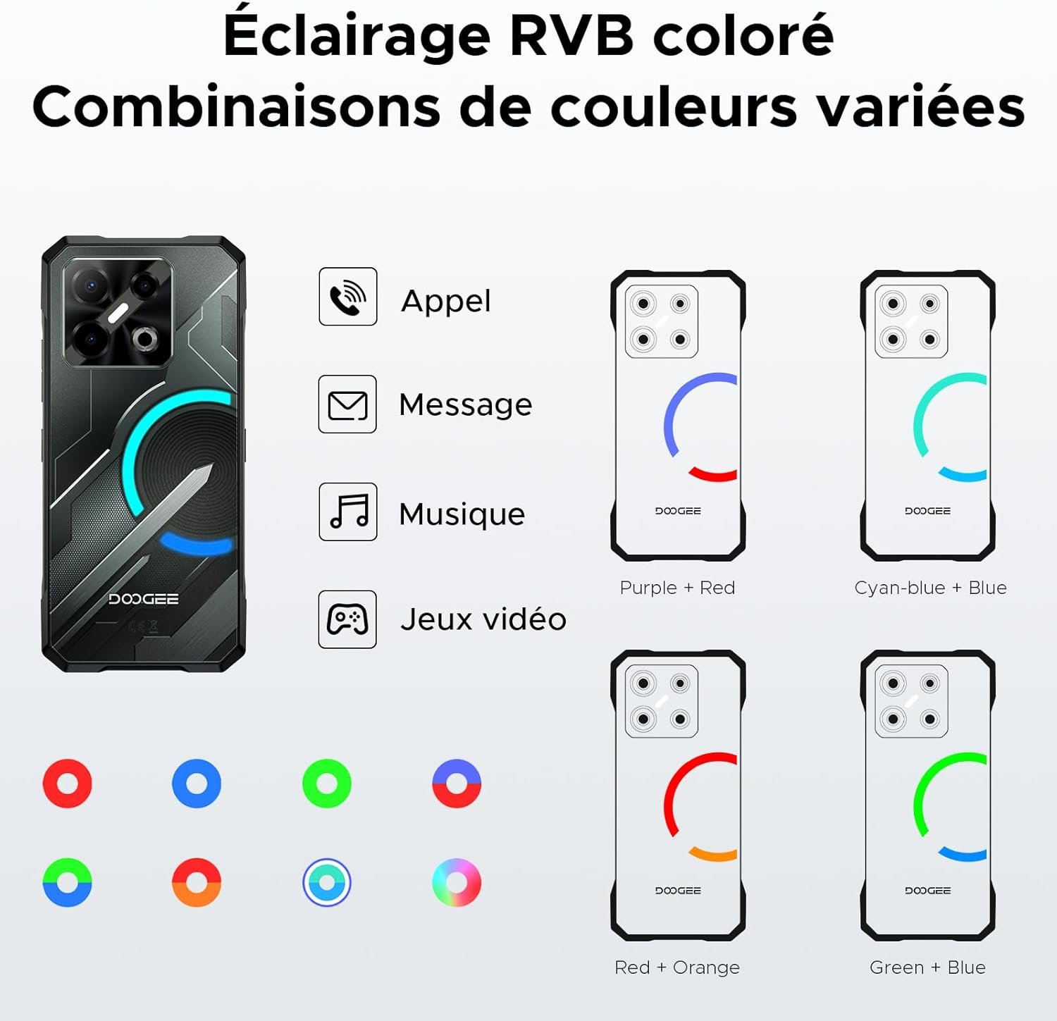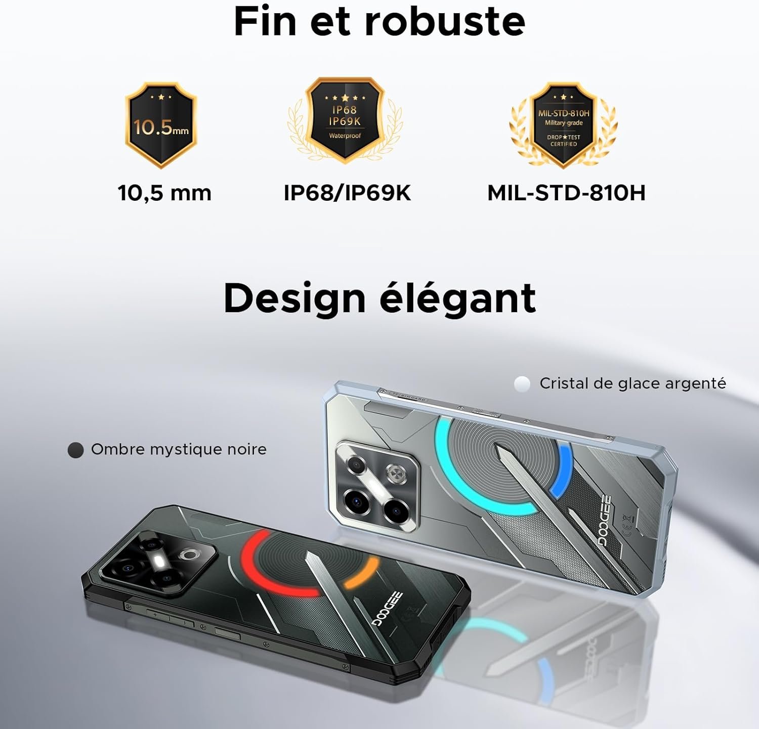 【Miroir lumineux et effet d’éclairage dynamique】Le nouveau design ultra-fin de 10,5 mm est léger et confortable à tenir. Le telephone portable incassable est équipé d’effets lumineux LED tendance. Lors d’appels entrants, de SMS ou de photos, la bande lumineuse combine différentes fréquences de flash pour créer différents langages lumineux, pour une expérience personnalisée. Le smartphone incassable s’adapte automatiquement à la lumière lors de la prise de vue, vous permettant de prendre des photos de nuit plus nettes. Activez le mode musique : l’effet d’éclairage suit le rythme, créant une expérience immersive de lumière et d’ombre, une fusion parfaite entre technologie et mode 【Performances puissantes, expérience fluide】Le téléphone incassable 5g Blade GT Play est équipé de la puce octa-core MediaTek Dimensity 7025, un processeur haute fréquence de 2,5 GHz avec gravure avancée de 6 nm, offrant des performances exceptionnelles et une excellente efficacité énergétique. Le téléphone doogee est équipé de 20 Go de mémoire vive (8 Go + 12 Go d’extension) et de 256 Go de stockage haute vitesse. Que ce soit pour le multitâche, les jeux ou le chargement d’applications, il gère facilement et sans latence 【6,72 pouces FHD+ 120 Hz IPS】Le telephone portable incassable DOOGEE Blade GT Play est équipé d’un écran goutte d’eau haute définition FHD+ de 6,72 pouces avec un taux de rafraîchissement élevé de 120 Hz, pour une image fluide et nette, et un impact visuel plus fort. La dalle IPS restitue les couleurs authentiques, pour une expérience plus immersive et fluide, que ce soit pour regarder des vidéos, jouer à des jeux ou naviguer au quotidien 【Triple caméra IA, capturez des images magnifiques】Le smartphone incassable est équipé d’un appareil photo principal IA de 50MP, offrant des détails plus nets et des images plus réalistes, et s’adaptant parfaitement à diverses scènes, de jour comme de nuit, en contre-jour. La caméra frontale haute définition de 16MP prend en charge la mise en beauté intelligente et le flou d’arrière-plan, pour une image plus naturelle, que vous preniez des selfies ou des appels vidéo. L’algorithme d’imagerie IA est entièrement pris en charge, identifiant intelligemment les scènes, optimisant les couleurs, les ombres et les lumières de l’image, et rendant chaque prise de vue plus colorée 【Batterie de 5800 mAh, autonomie ultra-longue】Le telephone android DOOGEE Blade GT Play est équipé d’une batterie intégrée de 5800 mAh, capable de supporter une utilisation intensive pendant une journée entière sans recharge fréquente. Regarder des vidéos, jouer à des jeux, naviguer et passer des appels est un jeu d’enfant. Grâce au mode d’économie d’énergie intelligent, il optimise automatiquement les applications en arrière-plan et les stratégies de consommation d’énergie, pour une autonomie en veille prolongée et une autonomie plus stable 【Déverrouillage multiple + NFC】①le smartphone incassable prend en charge la reconnaissance d’empreintes digitales latérale et le déverrouillage facial. Vous pouvez le déverrouiller rapidement d’une seule main, ce qui est sûr et efficace. Que vous portiez un masque ou que vous ayez du mal à toucher l’écran, vous pouvez facilement réactiver le téléphone, ce qui le rend plus fluide et plus accessible. ②Module NFC intégré, compatible avec Google Pay, pour un paiement mobile facile à utiliser. ③Achetez le DOOGEE Blade GT Play et obtenez une coque de téléphone gratuite