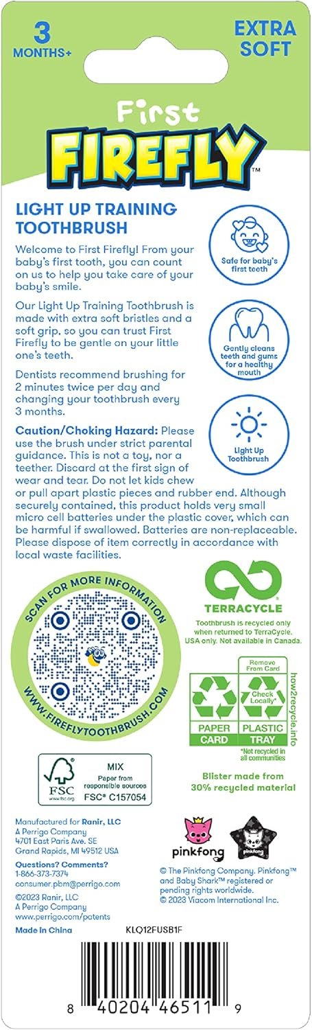 Comprend : 1 brosse à dents First Firefly Training, bébé requin Poils extra doux : dispose de poils arrondis extra doux qui sont doux pour les dents et les gencives de bébé Brosse à dents avec minuterie lumineuse : la minuterie lumineuse douce de 1 minute rend l’expérience plus attrayante et encourage un brossage plus long Doux : faites confiance à First Firefly pour nettoyer les dents de votre tout-petit en douceur et en toute sécurité. La brosse à dents d’entraînement est conçue pour les bébés, les nourrissons et les tout-petits Poignée souple antidérapante : dispose d’une poignée de brosse à dents antidérapante durable