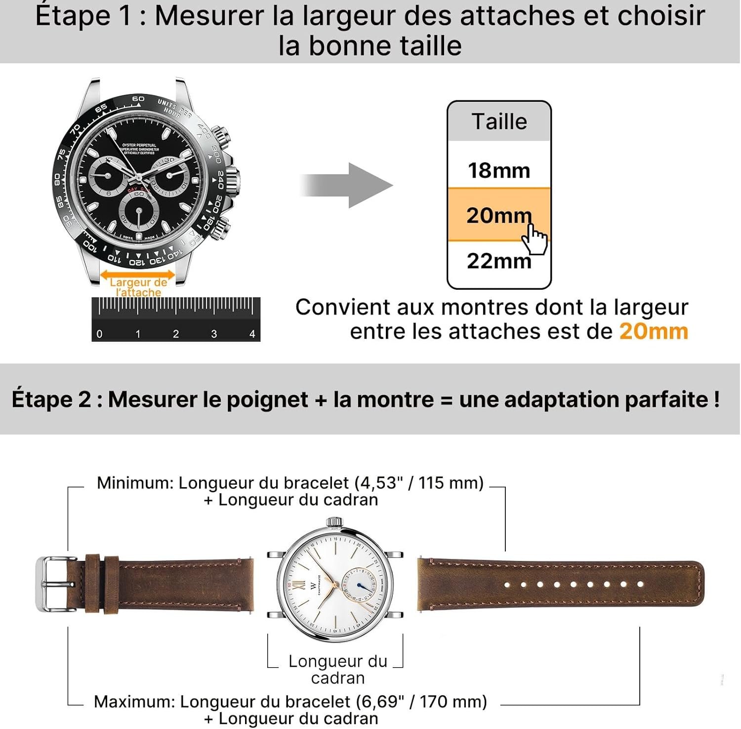 Bracelet en cuir de 20 mm : compatible avec toutes les montres classiques et montres intelligentes avec une largeur de connecteur de 20 mm compatible avec Samsung Galaxy Watch 7/6/5/4 40 mm 44 mm, Garmin Venu/Vivoactive, Huawei Watch GT, Withings Steel HR. (Remarque : veuillez vérifier la compatibilité avec notre guide de mesure en ligne avant l’achat) Cuir de qualité supérieure et confort : fabriqué en cuir pleine fleur souple pour plus de respirabilité et de douceur pour la peau. L’intérieur rembourré et la forme étroite assurent la liberté de mouvement, tandis que les bords tannés à l’huile et les coutures doubles protègent de l’humidité. Avec fermoir en acier inoxydable, parfait pour un usage quotidien. Changement facile : grâce au système de libération rapide, il suffit de glisser la barre à ressort avec votre doigt pour fixer ou détacher le bracelet sans outil en quelques secondes. Vérifiez la largeur de la languette ! Les tailles non correspondantes ne peuvent pas être installées. Bracelets de montre élégants et populaires : les bracelets en cuir ont un aspect classique et sophistiqué qui complète parfaitement de nombreuses tenues. Que ce soit pour la vie quotidienne, le travail au bureau, les voyages, les réunions professionnelles ou les fêtes, les bracelets marron et noir sont un excellent choix Achetez en toute confiance : notre lot de 2 boucles de bracelet classiques est conçu pour les hommes et les femmes et convient aux poignets de 155 à 210 mm. Idéal comme cadeau bien pensé pour les parents, les partenaires ou les amoureux pour des occasions telles que l’obtention d’un diplôme, un anniversaire, Noël, Thanksgiving, la fête des mères, la fête des pères et la Saint-Valentin. Support 24h/24 et 7j/7 – Contactez-nous à tout moment pour toute question