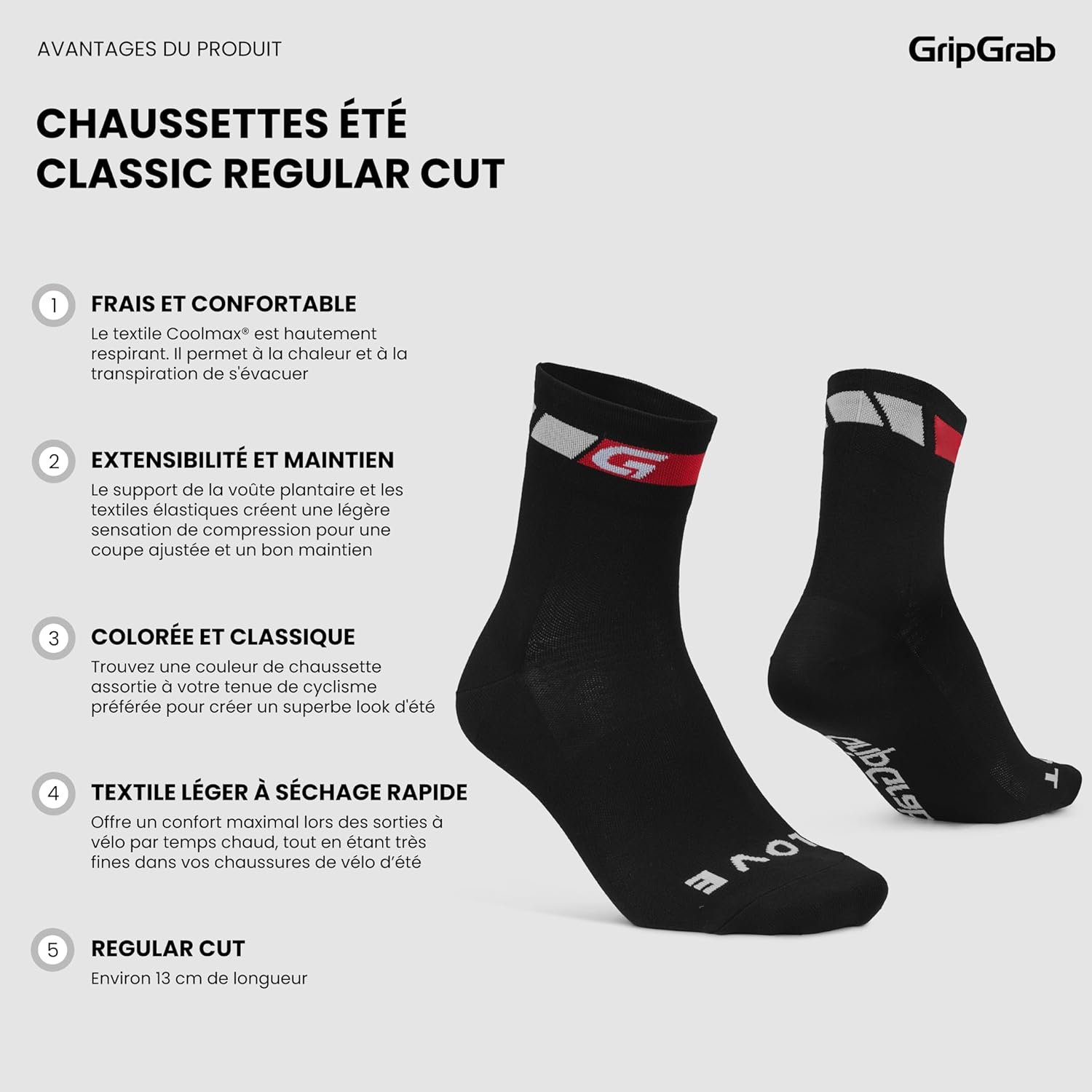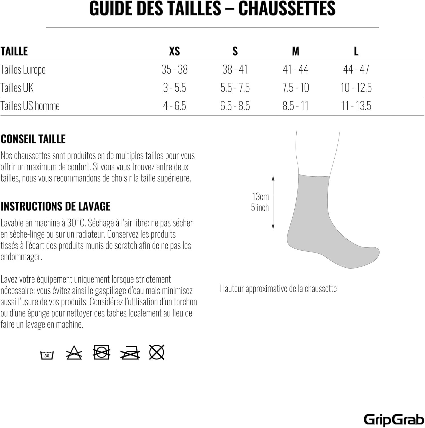 Les chaussettes sont disponibles en différentes tailles (XS à L) et sont fabriquées à partir d’un mélange de matériaux acryliques, polyamides, polyesters, coton et polyuréthane. Le fabricant, GripGrab, propose différentes options de couleurs et de tailles pour s’adapter à tous les cyclistes.