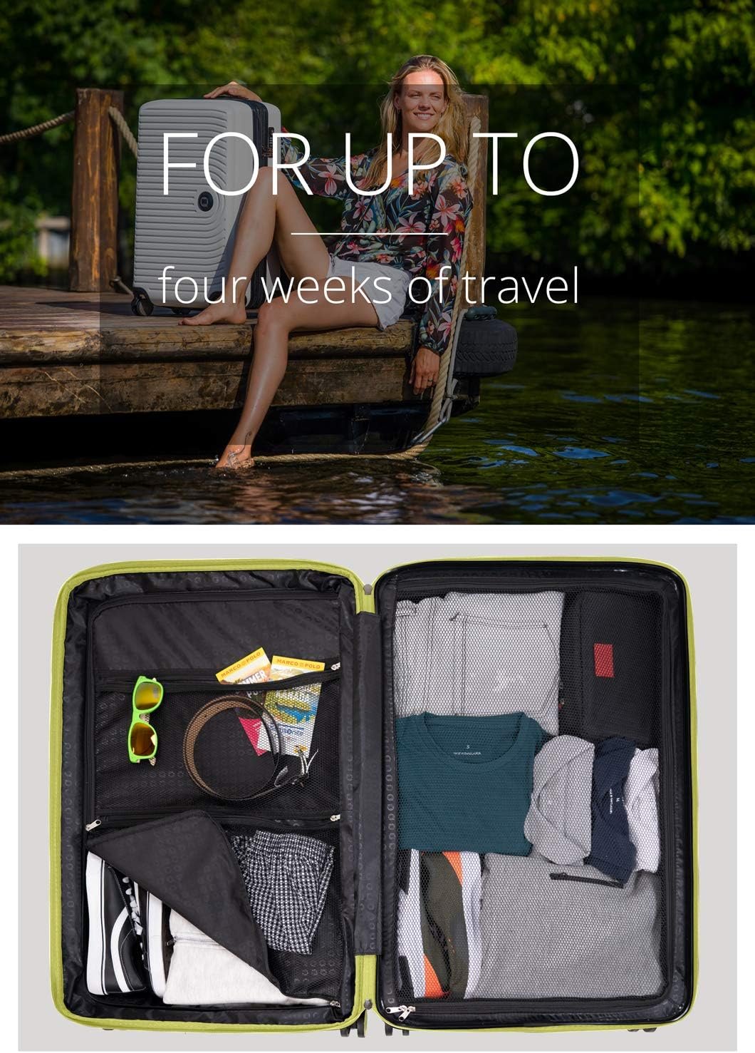 Avec ses dimensions de 77 x 50 x 30 cm, cette valise est le partenaire parfait pour des vacances en famille ou des escapades autour du monde. Grâce à son extension de 8 cm, elle passe à 77 x 50 x 38 cm pour un volume maximal de 130 litres.