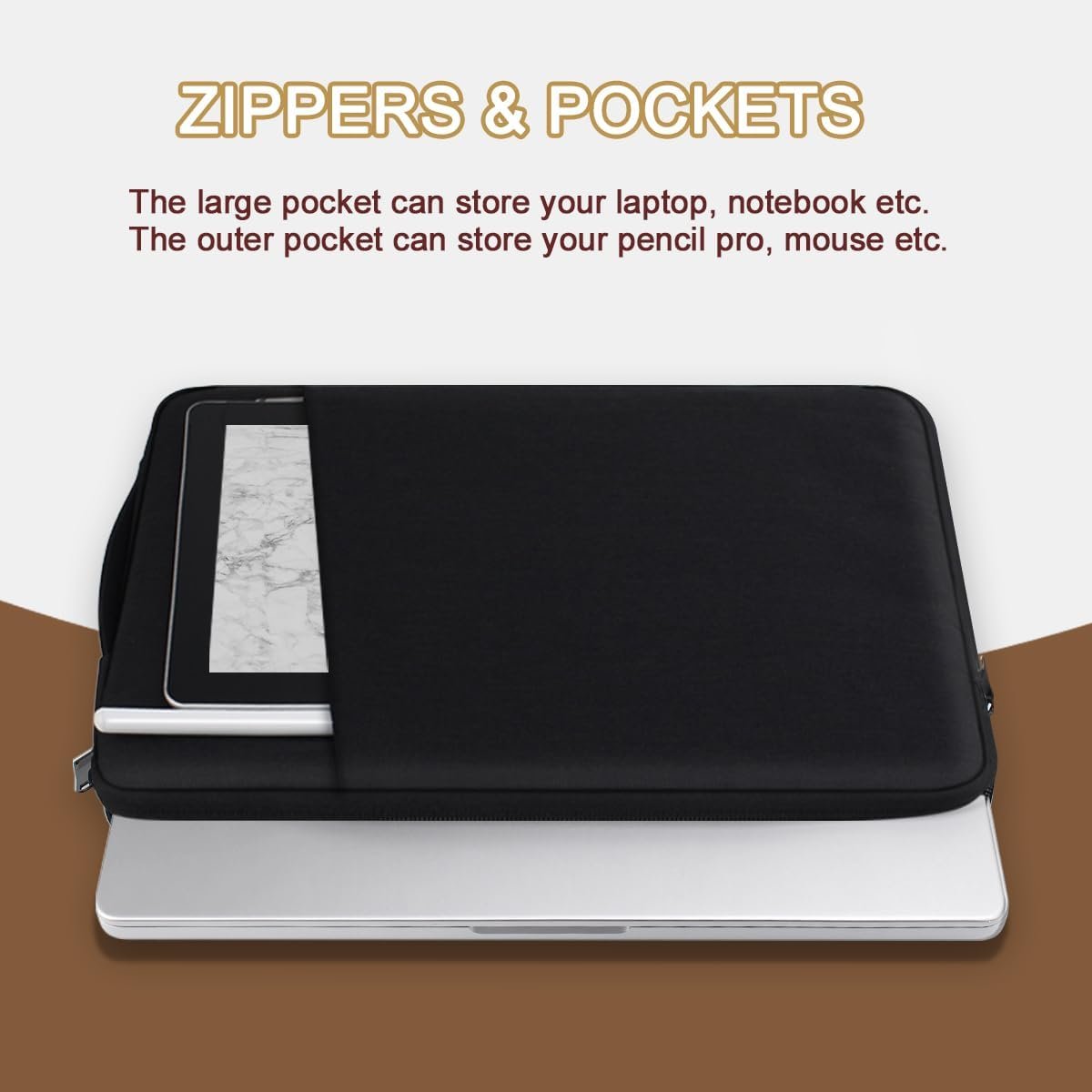 Fermetures éclair et poches : la fermeture éclair lisse en acier inoxydable peut empêcher votre ordinateur portable de glisser hors de la housse. Fermeture éclair bidirectionnelle pour une utilisation facile. 2 poches intérieures et extérieures. La grande poche peut stocker votre ordinateur portable, ordinateur portable, tablette et autres accessoires ; la poche extérieure peut stocker votre tapis de souris, écouteurs, câble de charge, etc.