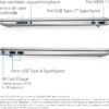 La connectique complète comprend un port USB-C SuperSpeed, deux ports USB-A SuperSpeed, un port HDMI 1.4b, un lecteur de carte SD multiformat, une prise combinée casque/micro et un adaptateur secteur Smart Pin. Ce PC portable fonctionne sous Windows 11 Famille.