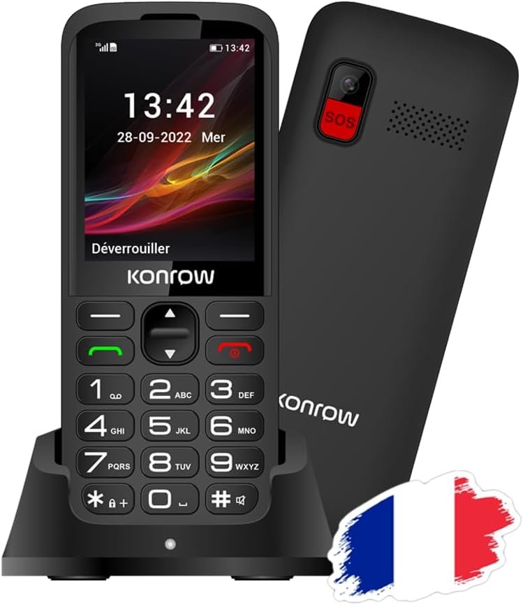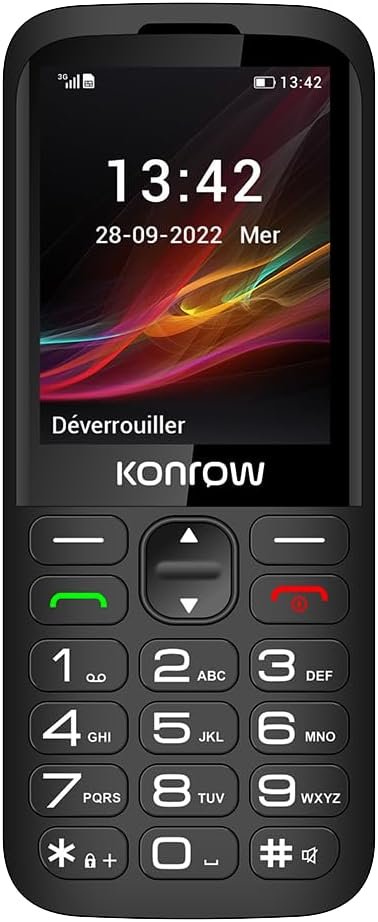 Très simple d’utilisation : un téléphone portable simplissime ! Conçu avec de grosses touches et un grand écran 2,8″ étudié pour une lisibilité optimale, le mobile Senior 280 vous permet une excellente prise en main Idéal pour les personnes âgées : profitez de l’essentiel avec ce téléphone basique qui bénéficie d’un bouton SOS à l’arrière en cas d’urgence. Il comprend également un appareil photo VGA, le Bluetooth, une double SIM et fonctionne avec le réseau 2G Station de charge : le Senior 280 dispose d’un socle de chargement, votre mobile se recharge sans avoir besoin de le brancher avec un câble. Utilisez-le pendant 5 heures maximum en communication. Il tient jusqu’à 80 heures en veille Accessoires fournis : le Konrow Senior 280 est livré avec 1 chargeur USB-C, 1 socle de charge et 1 guide d’utilisateur. Il est équipé d’un processeur MTK6261D, d’une mémoire de stockage extensible jusqu’à 8 Go, de 32 Mo de RAM et d’une batterie 1700 mAh Garantie de 24 mois : ce produit est garanti pendant 24 mois contre tout défaut de fabrication pour votre plus grande satisfaction. N’hésitez pas à nous faire part de vos commentaires sur nos modèles, nous serons ravis de connaître votre avis