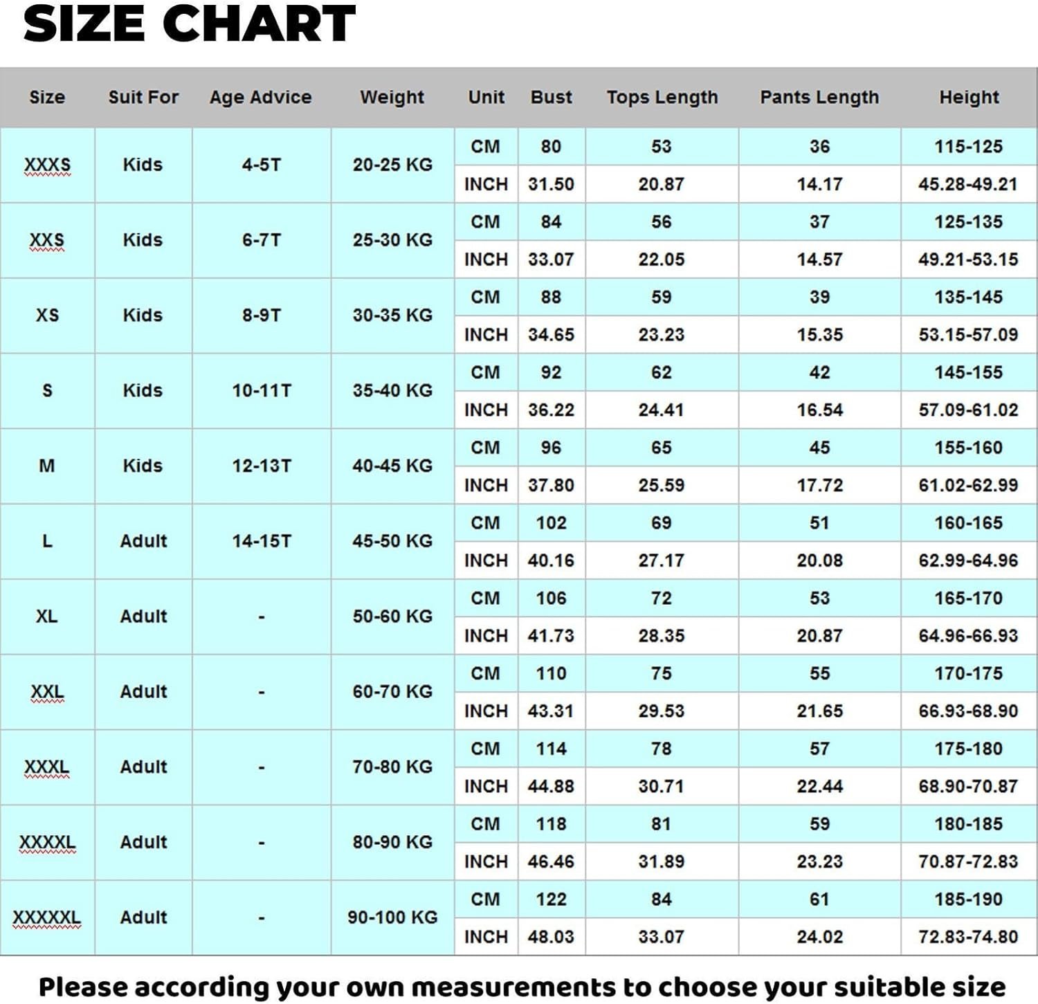 – Taille XXXL : buste 114cm, longueur du haut 78cm, longueur du pantalon 57cm, poids 60-70 KG, taille 175-180cm.
