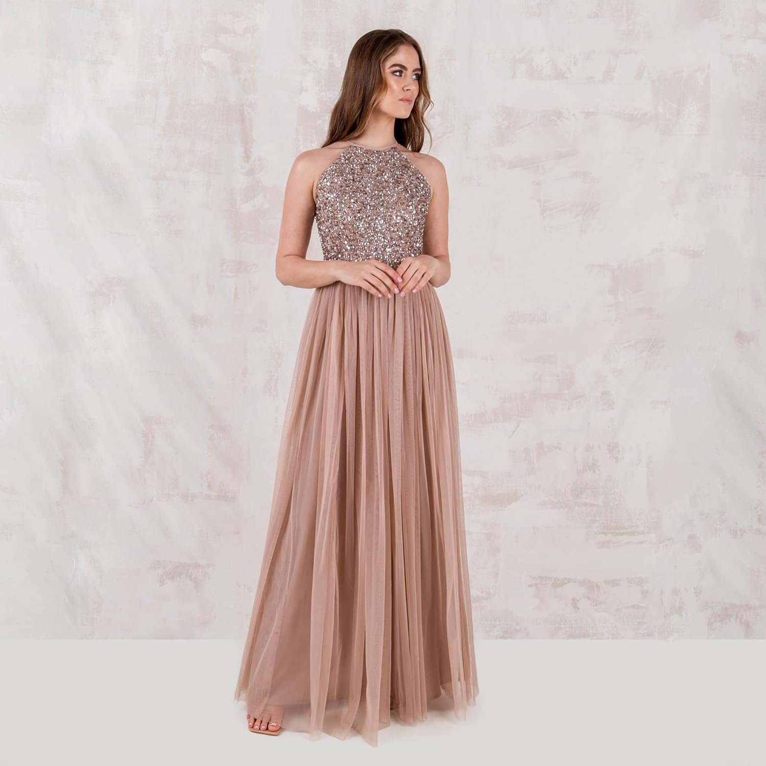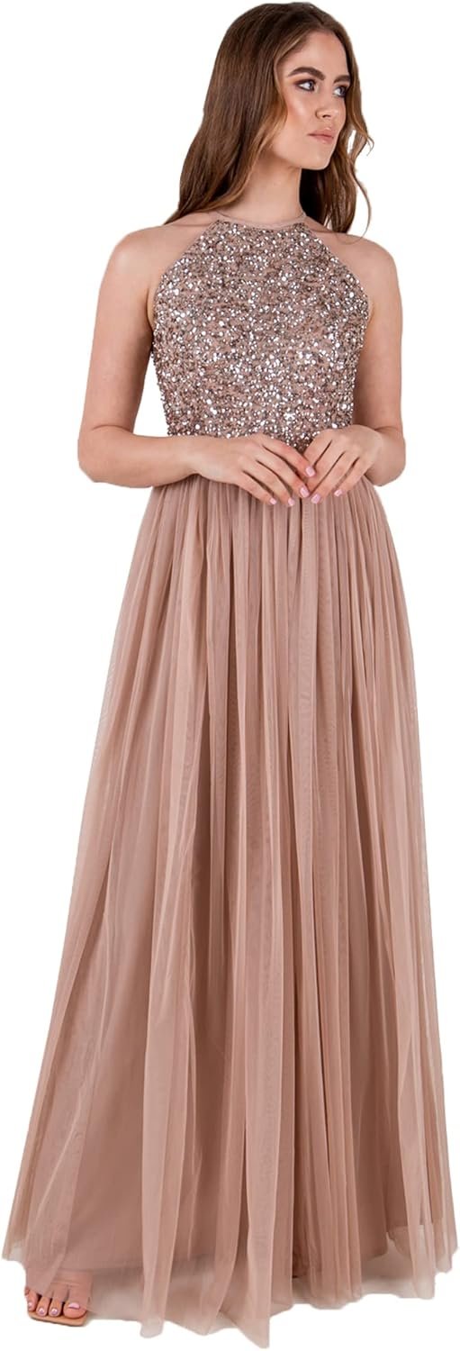 Les caractéristiques de la robe incluent une décoration, une doublure, un dos nu et une longueur maxi, avec une fermeture éclair invisible dans le dos. Le fabricant Maya Deluxe propose cette robe avec les dimensions de colis suivantes : 36 x 31 x 10,1 cm et un poids de 520 grammes. La robe a obtenu une note moyenne de 4,0 sur 5 étoiles basée sur 466 évaluations.