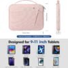 Cette étui portable est conçu pour les tablettes de 9 à 11 pouces, offrant une protection et un rangement efficaces. Il est compatible avec divers modèles, notamment les iPad et les Galaxy Tab. L’étui dispose de plusieurs poches, dont une poche principale pour la tablette, une boucle pour stylo, des poches en filet et des boucles élastiques. La structure en trois couches de l’étui offre une protection renforcée contre les chocs et les rayures.