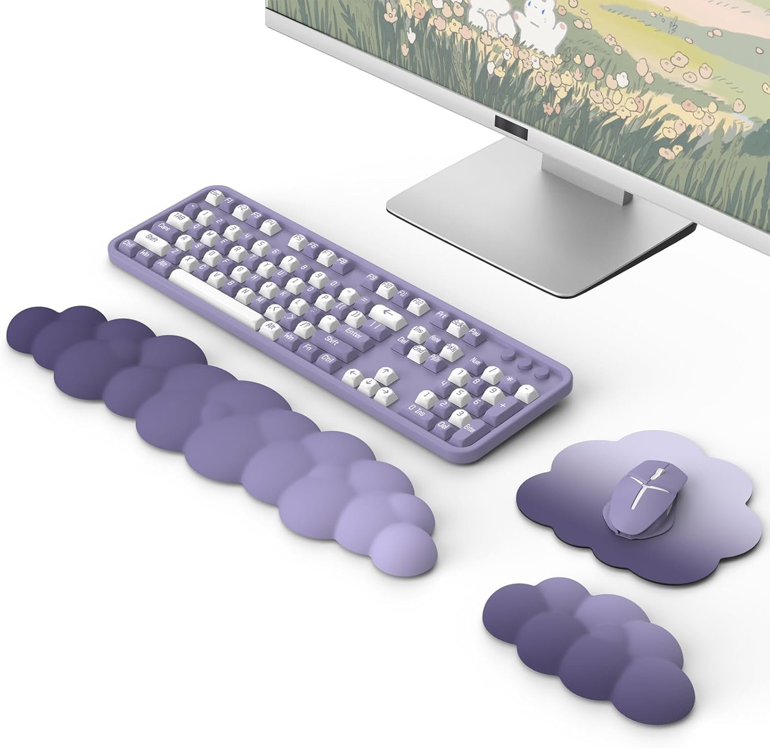 【Forme de Nuage Adorable】 Le set de repose-poignets ergonomique pour clavier et souris a la forme d’un nuage à bulles, ajoutant une touche d’amusement et d’élégance à votre espace de travail, ce qui donne également à votre poignet une sensation de douceur et de confort. Parfait pour les joueurs, les employés de bureau, les informaticiens et ceux qui aiment personnaliser leur décor de bureau et leurs accessoires de bureau.
