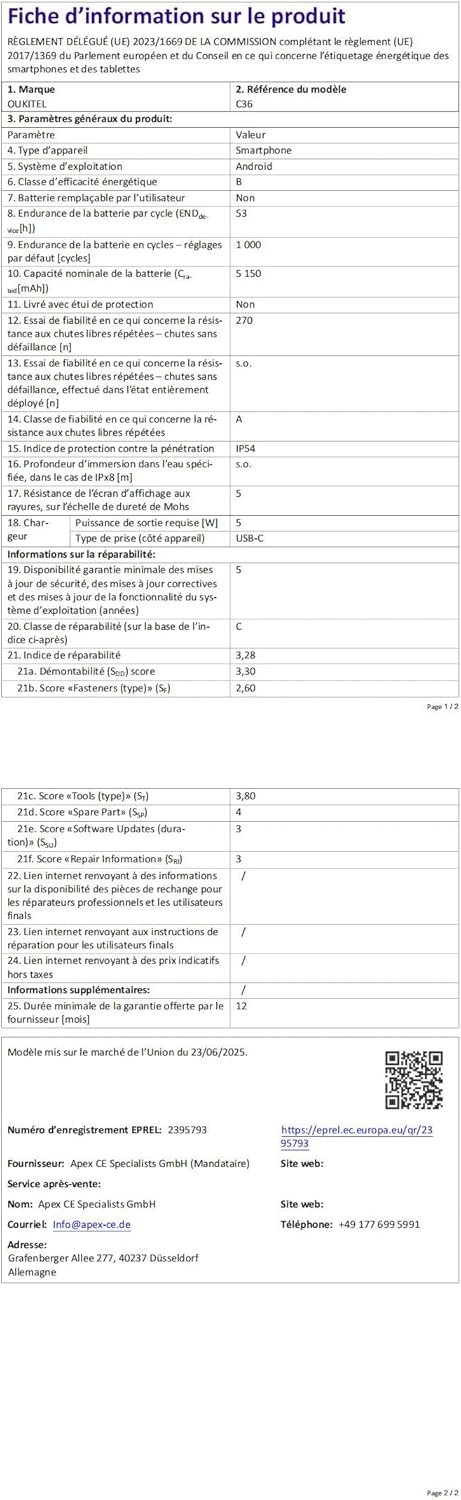 OUKITEL C36 256Go Téléphone x 1 ; Câble de données USB x 1; chargeur x 1; Outil SIM x 1; Manuel d’utilisation x 1; Étui de protection en silicone x 1