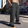 Découvrez ce pantalon confortable pour hommes, conçu avec une taille élastique, un cordon de serrage et des jambes larges. Il est disponible en plusieurs couleurs et présente un design droit et élégant. Les images montrent le pantalon sous différents angles, mettant en valeur son style polyvalent.