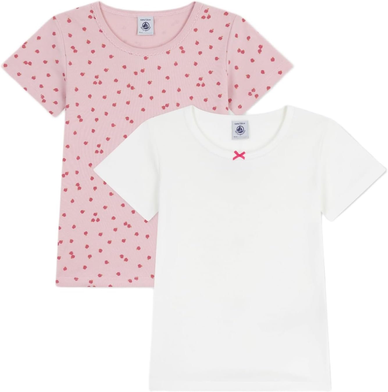 Voici un lot de deux tee-shirts pour fille en côte 1X1, conçus pour offrir confort et élasticité. La collection comprend un modèle uni et un autre avec un imprimé de pommes, offrant ainsi deux styles distincts.