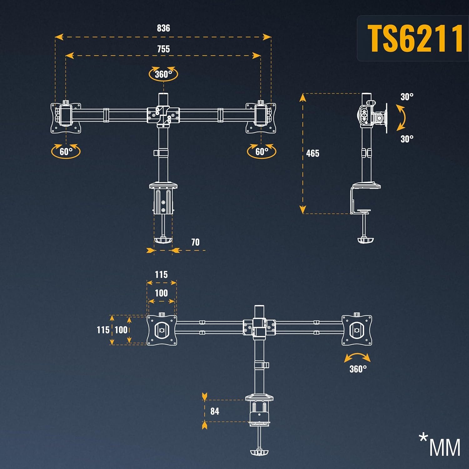 Ce support est idéal pour les postes de travail productifs, car il permet une rotation de 360°, une inclinaison de +/- 30° et une hauteur réglable. La pince de fixation au bureau est adaptable à des épaisseurs de 10 à 80 mm. Le support est également équipé d’un serre-câble pour maintenir les câbles en ordre.
