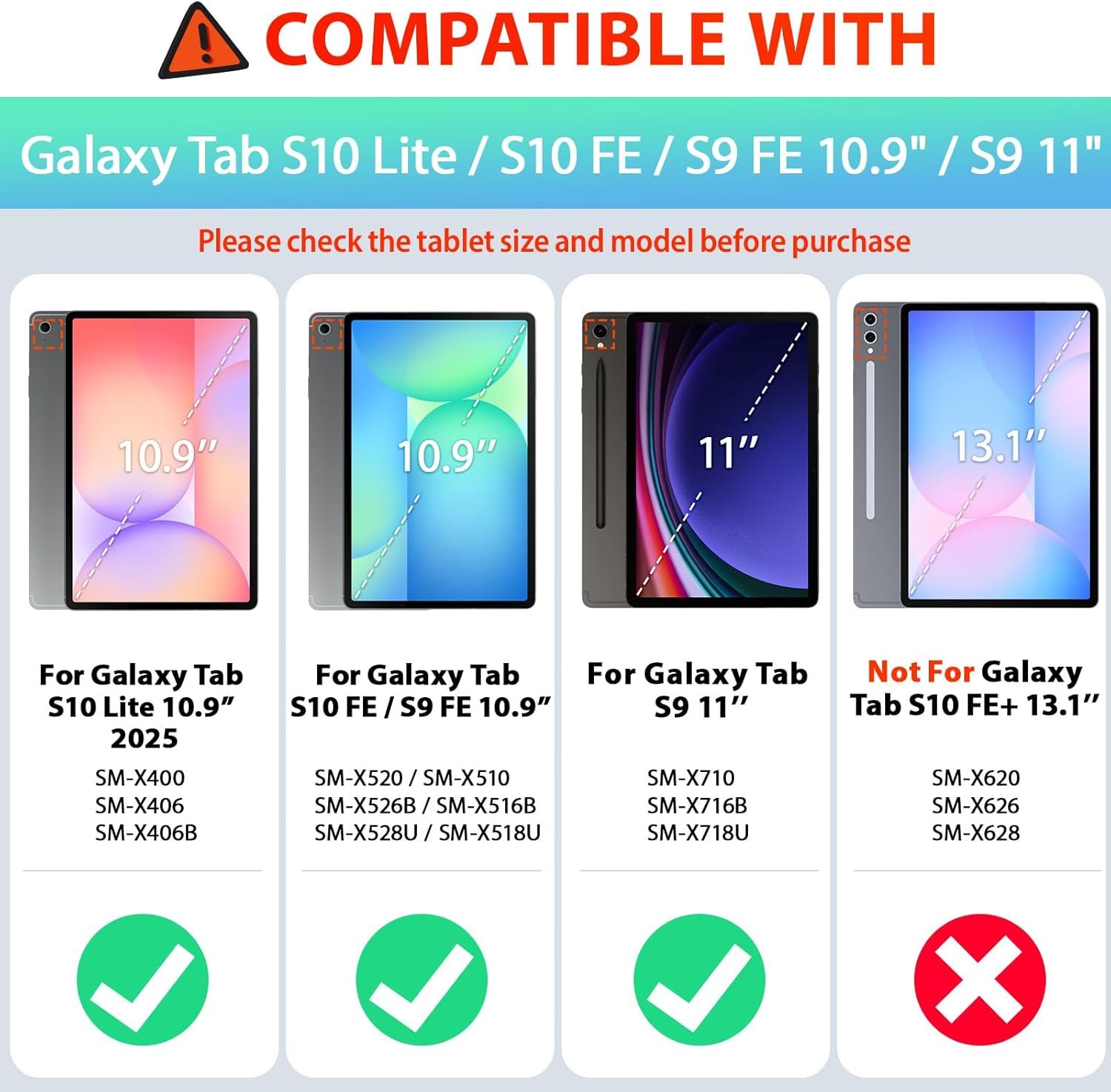 【Modèle compatible】 : compatible uniquement avec Samsung Galaxy Tab S10 Lite / S10 FE 10,9 pouces 2025 / S9 FE 10,9 pouces / S9 11 pouces 2023 (modèles : SM-X400, SM-X406, SM-X520, SM-X526, SM-X510, SM-X516B, SM-X710N, SM-X716B, SM-X718U). Veuillez confirmer le numéro de modèle de votre tablette avant d’acheter.