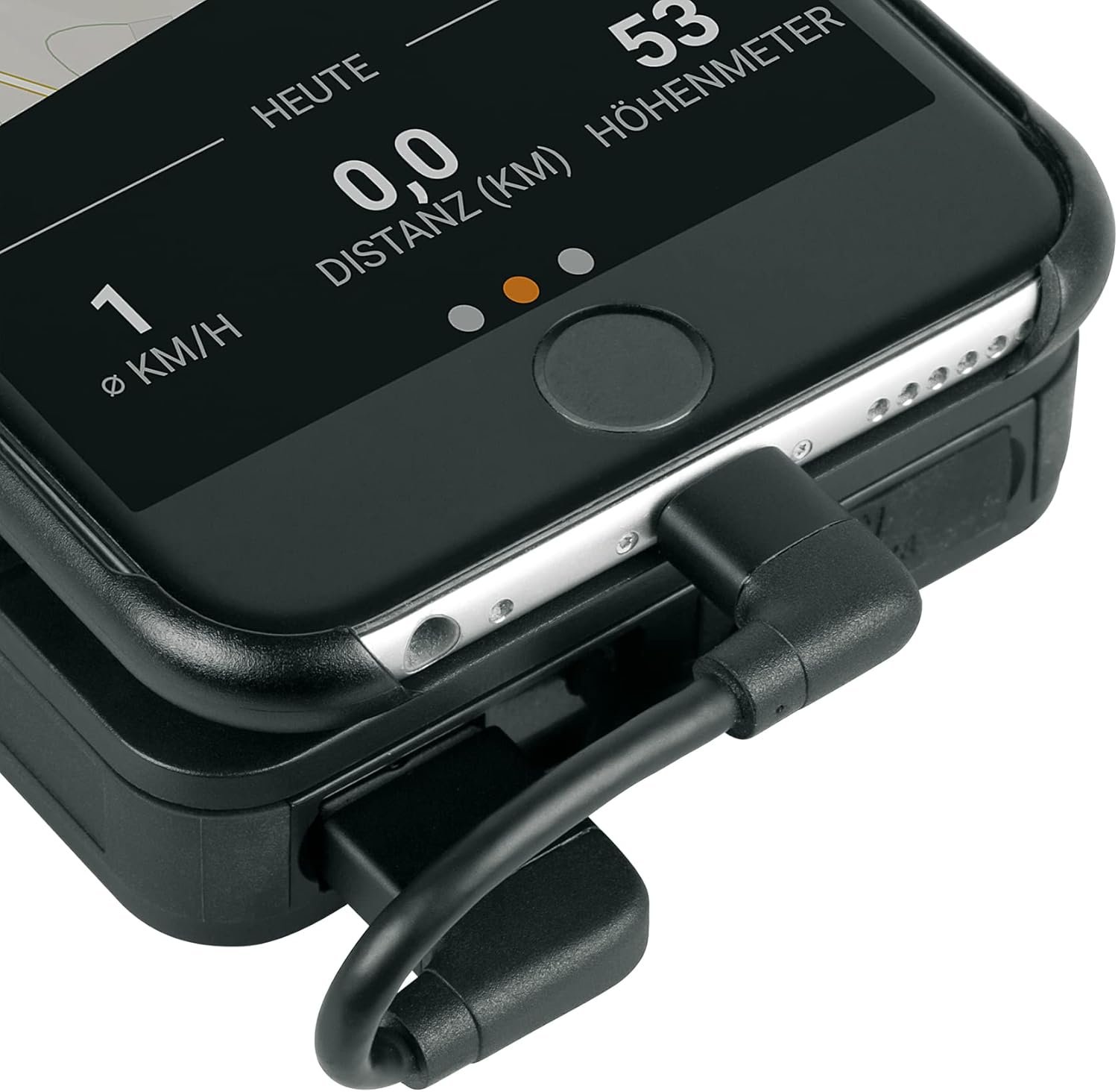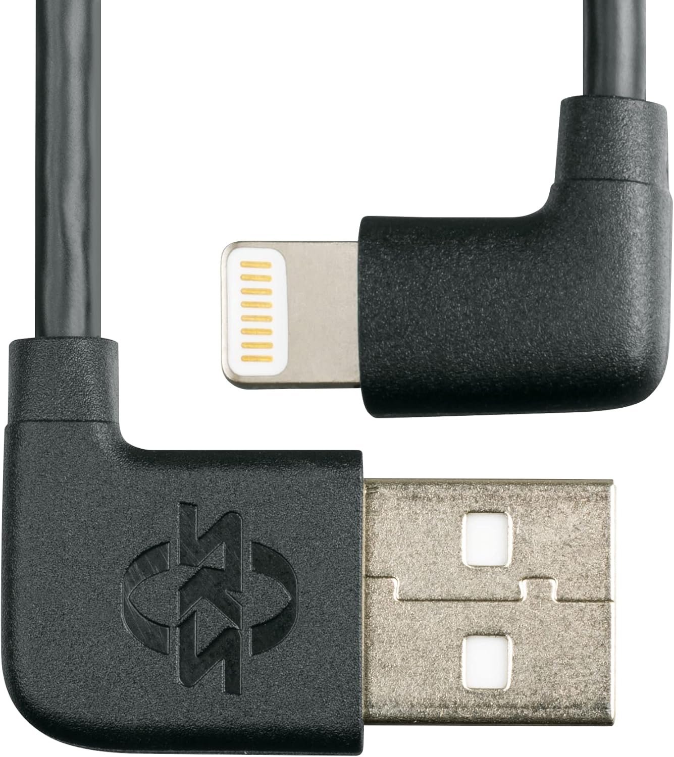 Pratique et discret: le câble Lightning extra court pour l’iPhone évite l’enchevêtrement des câbles sur le vélo et la fiche coudée protège le chargeur contre les dommages.