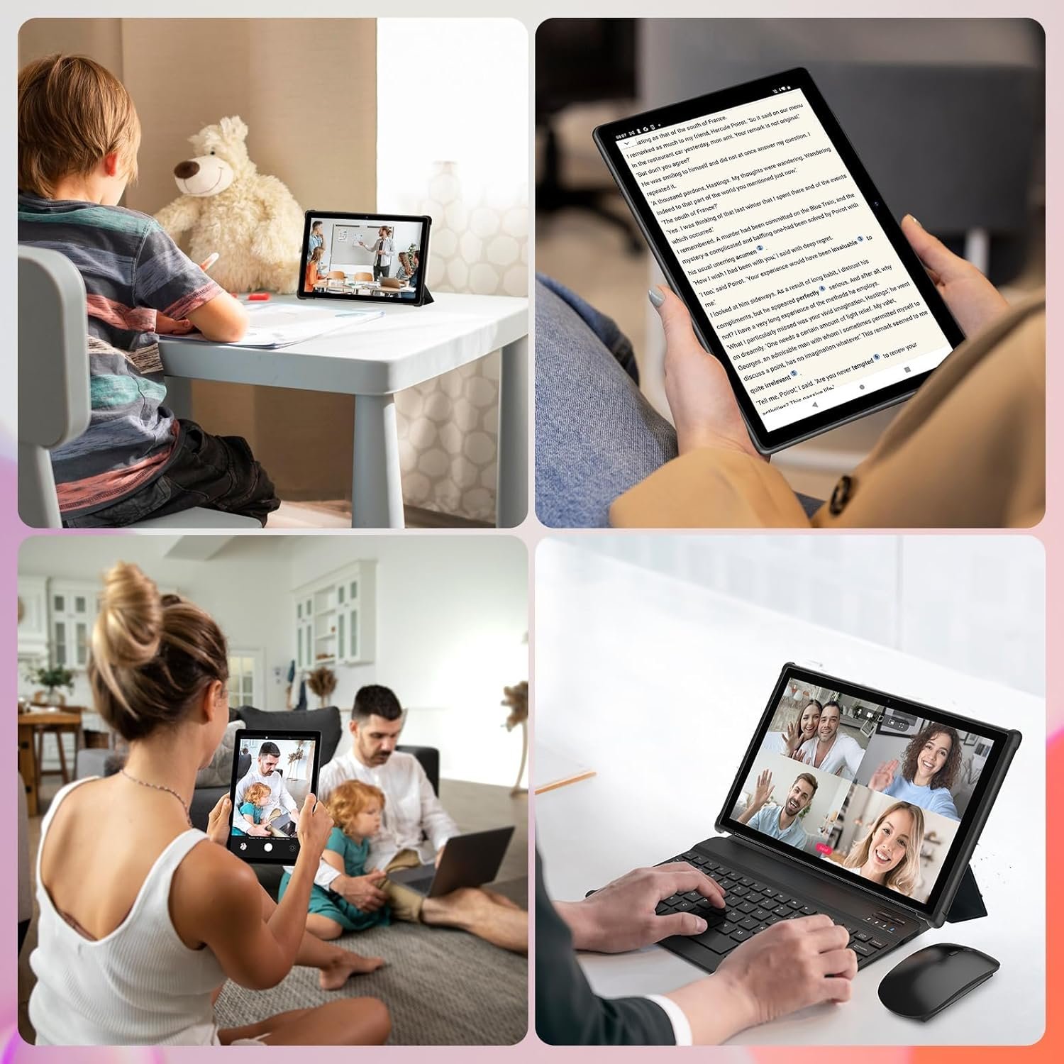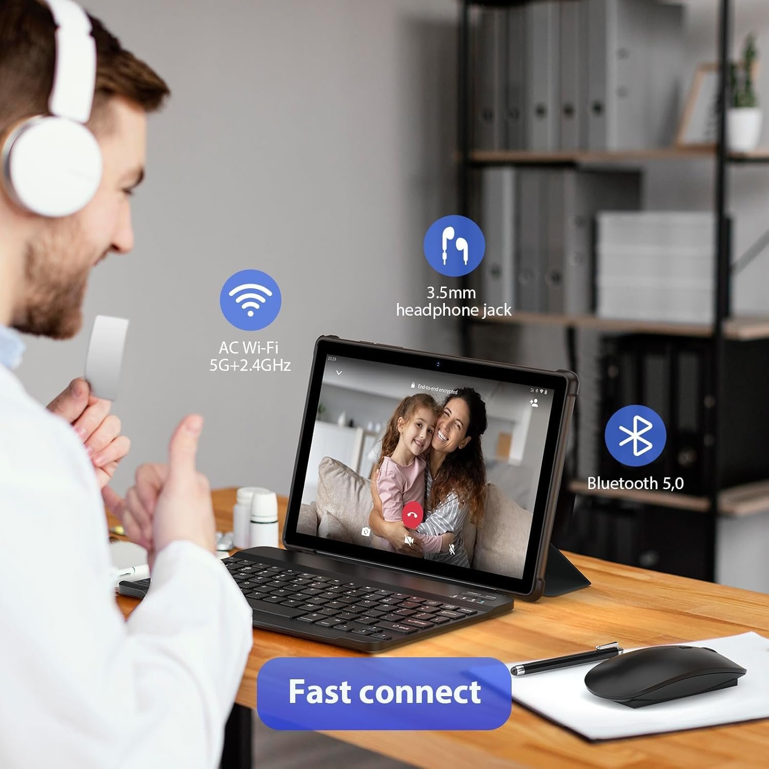 【Système Android 14】Équipée du système Android 14, cette tablette permet de lancer rapidement les applications et offre une exécution plus fluide de vos applications. Cette tablet Android est dotée du processeur octa-core le plus stable, avec une fréquence maximale de 2,0 GHz, améliorant la vitesse d’exécution des programmes et la mobilité de la navigation web, offrant ainsi une expérience utilisateur plus rapide. 【36GB RAM + 128GB ROM】Cette tablette 10 pouces dispose de 36GB de RAM, comprenant les 12GB de base de la tablette, auxquels s’ajoutent 24GB de mémoire virtuelle configurables dans les paramètres, pour un total de 36GB de mémoire vive. Avec 128GB de stockage interne et une extension possible jusqu’à 2To, vous avez suffisamment d’espace pour vos photos, vidéos et musiques. Résolution: Profitez d’une superbe expérience visuelle grâce à l’écran IPS 1280 x 800 pixels. 【Tablette Haute Performance】La tablette 10,1 pouces prend en charge le Wi-Fi 5G/2,4 GHz, offrant une connexion réseau plus rapide et plus stable grâce aux deux canaux. Elle inclut également des haut-parleurs doubles et le Bluetooth 5.0, répondant aux besoins d’apprentissage en ligne et d’appels vidéo. Profitez de plus de fonctionnalités pour une expérience mobile et productive enrichie.: Restez connecté avec le WiFi 6, la 5G, le Bluetooth 5.0 et les services Google Mobile (GMS). 【Multifonctionnelle + Batterie de 8000mAh】Profitez d’une gamme de fonctionnalités telles que la projection d’écran, le les permissions de confidentialité, le confort oculaire, etc. La batterie de 8000mAh prolonge le temps d’utilisation. Cette tablette Android 14 est conçue pour répondre à vos besoins variés et enrichir votre mode de vie numérique. Capturez de magnifiques photos et vidéos avec les caméras arrière 8MP et avant 5MP. 【Tablette 2 en 1 avec Clavier】La tablette tactile est fournie avec un clavier Bluetooth, des écouteurs, une souris, un stylet et une housse de protection pliable, vous permettant de transformer facilement votre tablette 10 pouces en ordinateur portable. C’est le compagnon idéal pour le divertissement ou le travail, et le meilleur choix de cadeau pour la famille, les amis et les enfants. De plus, cette tablette offre un support de service à vie. Si vous avez des questions concernant cette tablettes Android, n’hésitez pas à nous contacter, nous vous fournirons un support technique et un service client rapidestre productivité grâce au clavier physique inclus avec cette tablette.
