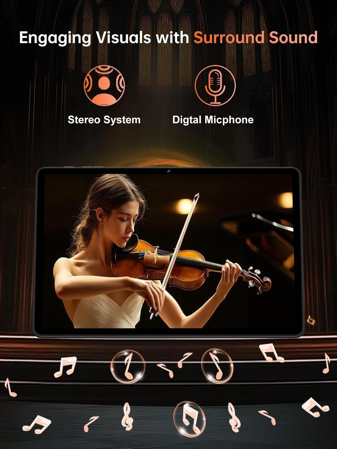 【11-Inch Visuels fluides et homogènes】Cet écran LCD flexible de 11 pouces est spécialement conçu pour s’émerveiller, avec son rapport écran/corps de 90 % et son rapport de productivité de 3:2. Les toutes nouvelles capacités d’affichage Dghrti X-Tru améliorent les contrastes de luminosité, de sorte que chaque scène de film est un spectacle visuel et sonore. Obtenez plus d’un coup d’œil et ménagez vos yeux, avec des capacités anti-éblouissement et anti-reflets. 【Dernier système Android 14】Le TAB50 exécute le système Android 14, libérez un potentiel infini, embrassez un avenir brillant ! assurant le fonctionnement transparent et efficace de diverses applications sur l’appareil. De plus, Android 14 introduit des fonctionnalités de confidentialité et de sécurité de pointe qui offrent aux utilisateurs une gamme d’options de paramètres personnalisés pour répondre à leurs besoins de confidentialité 【Multitâche ultra-rapide】Exploitez la puissance du chipset Unisoc T606 combiné à jusqu’à 24 Go de RAM (extension 8 Go + 16 Go) pour des capacités multitâches supérieures. Avec 256 Go de stockage UFS 2.2 haute vitesse, extensible jusqu’à 2 To, vous aurez tout l’espace dont vous avez besoin pour vos applications, vos médias et vos fichiers, garantissant des performances rapides et efficaces. 【Durabilité légère】 Conçu pour la mobilité, le TAB50 ne pèse que 517 g et a un profil mince de 7 mm. Son corps en aluminium usiné CNC avec une finition sablée offre une durabilité robuste sans compromettre le style, ce qui en fait le compagnon idéal pour une utilisation en déplacement. Le TAB50 redéfinit l’élégance avec sa silhouette élancée de 7 mm, incarnant le zénith du design et de la durabilité. 【Autonomie de la batterie toute la journée】 Restez alimenté avec la batterie de 8000 mAh, offrant jusqu’à 10 heures d’utilisation. Le type de charge vous permet de passer moins de temps branché et plus de temps à vous attaquer à vos tâches, ce qui le rend idéal pour une productivité tout au long de la journée. 【Capturez la perfection】 Capturez l’essence de la perfection avec la caméra arrière autofocus avancée de 13 MP du TAB50 et une caméra frontale raffinée de 5 MP. Ces caméras haute fidélité offrent des images d’une clarté époustouflante et des appels vidéo fluides, encapsulant l’essence de la photographie phare. Dghrti Son 3D vous plonge dans une expérience d’écoute sans pareille, grâce à sa gamme de haut-parleurs multi-pilotes inégalée et à son champ sonore stéréo. 【WIFI+Widevine L1】Profitez d’un Wi-Fi ultra-rapide qui traverse les murs et renforce les téléchargements et la connexion stable à 360°, avec une technologie d’antenne haute efficacité convergée multimode de pointe, une technologie d’antenne discrète en mode et une disposition d’antenne surround. Prise en charge de Widevine L1 et Netflix HD. Plongez-vous dans des effets sonores panoramiques avec le système de haut-parleurs doubles de pointe.
