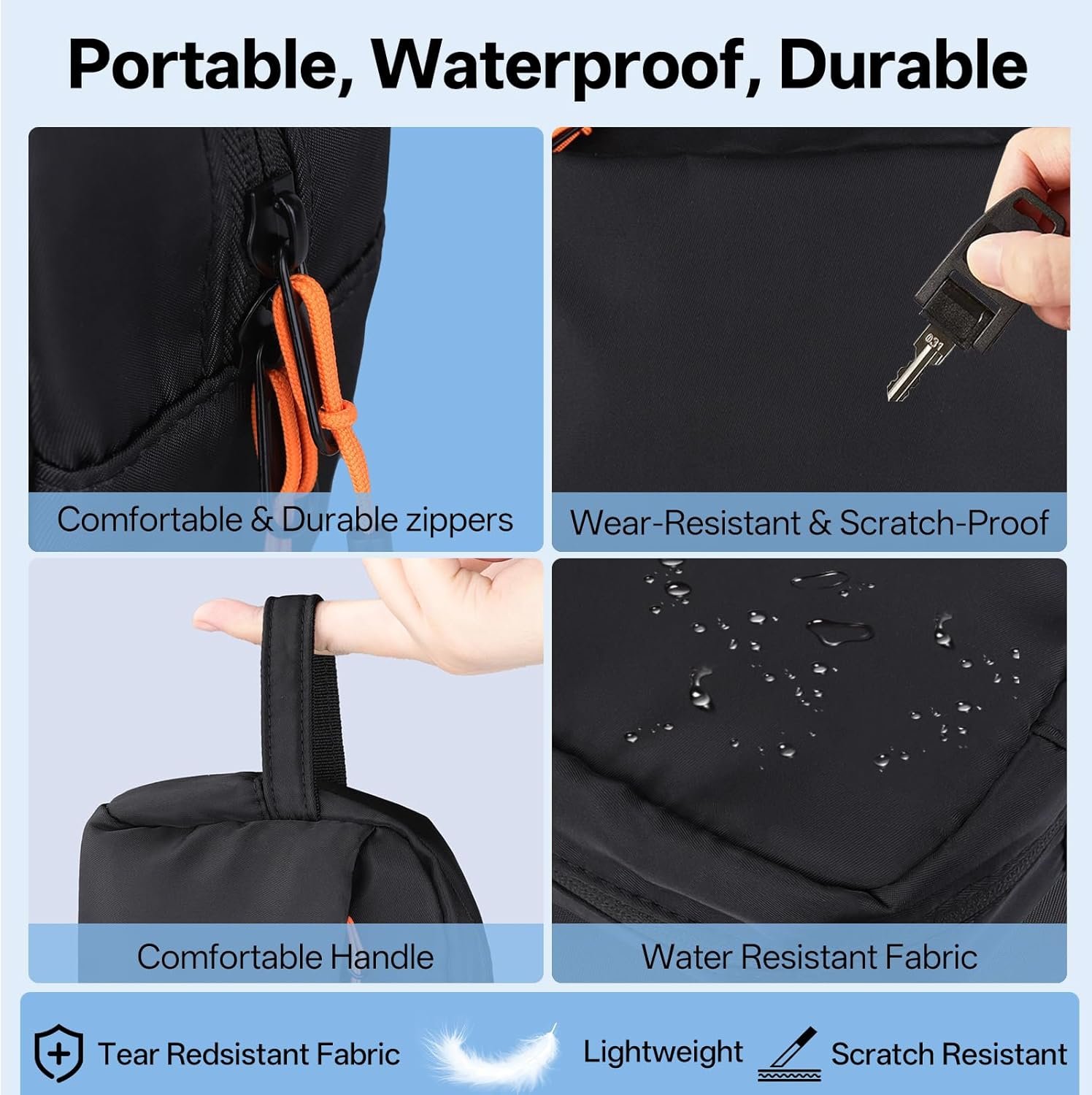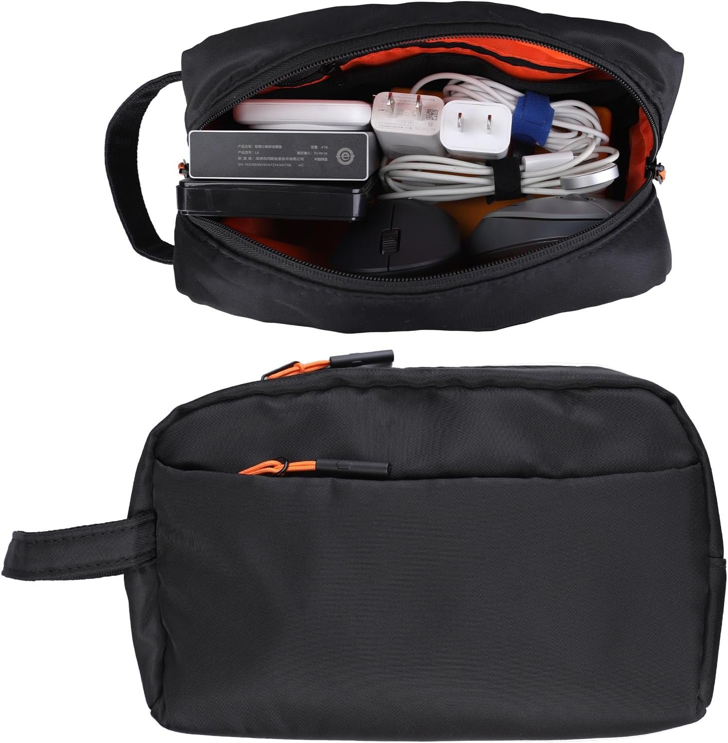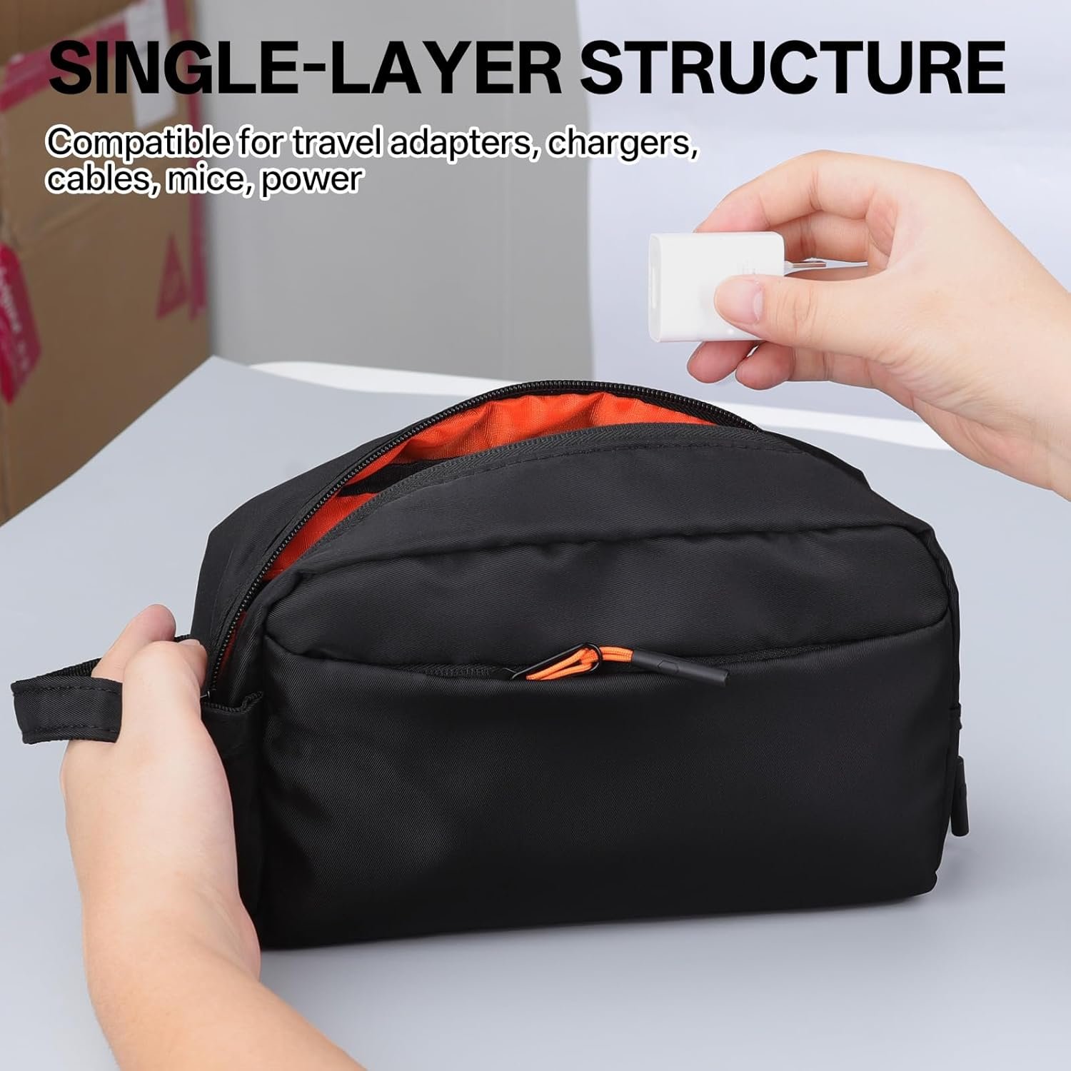 【Structure Monocouche】Ce produit adopte une structure monocouche et est conçu avec 2 compartiments à fermeture éclair. Il dispose d’un compartiment inférieur zippé plus large pour les adaptateurs d’alimentation et les chargeurs plus épais, et d’un petit compartiment zippé pour les petits objets importants.