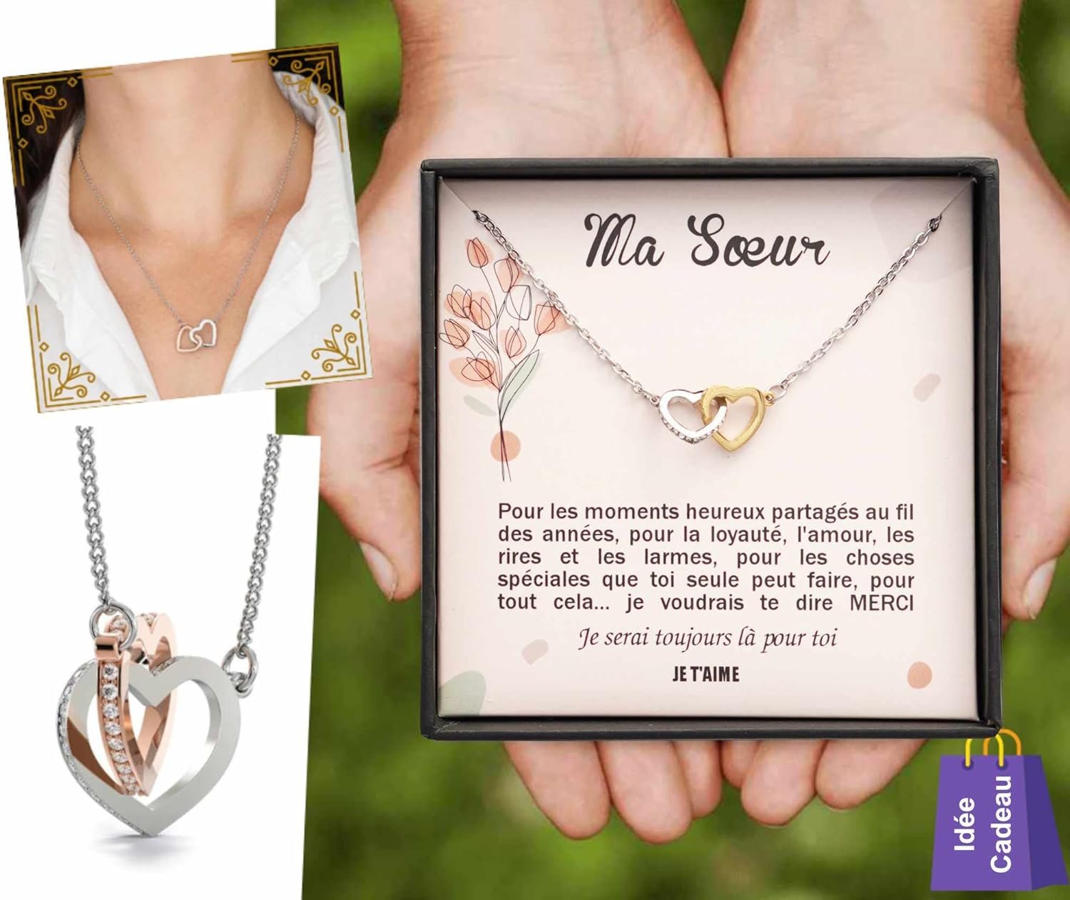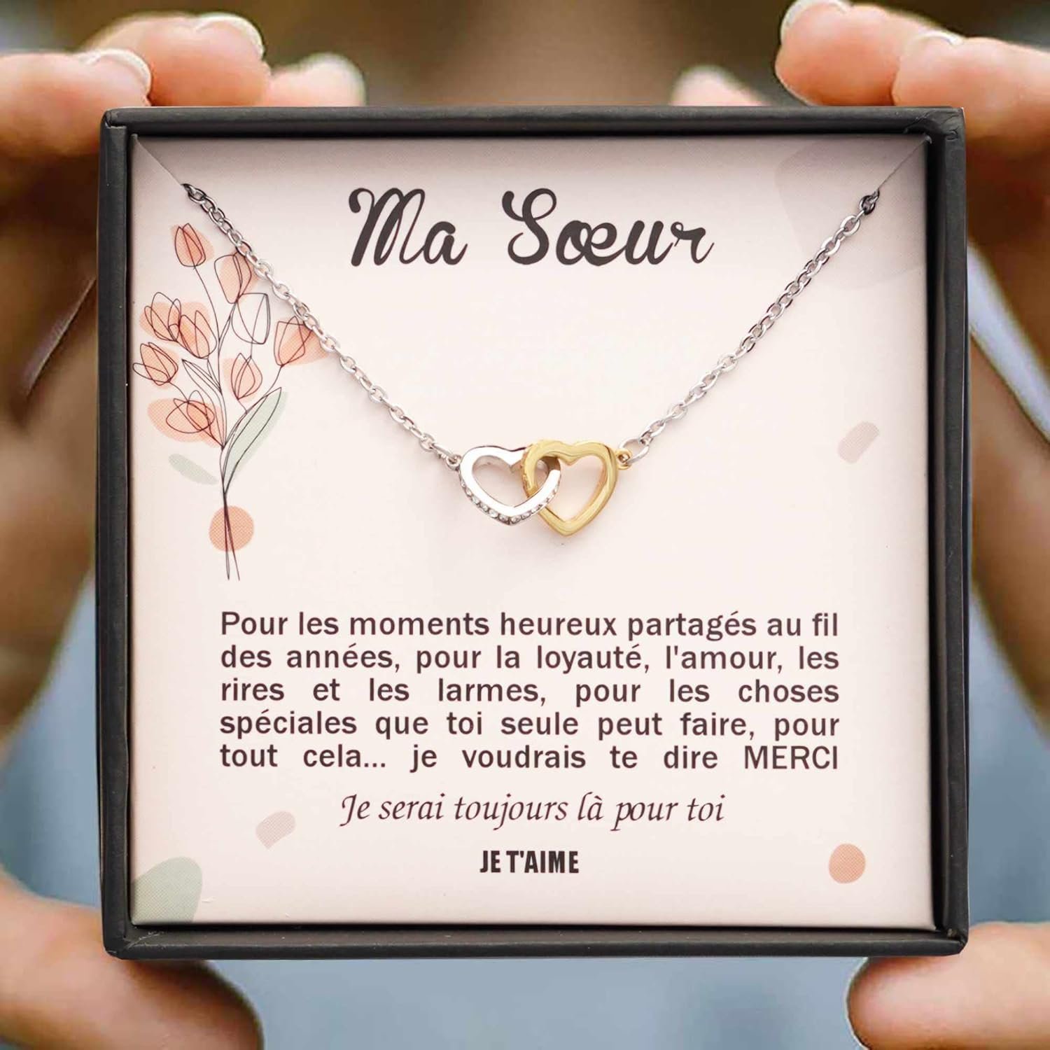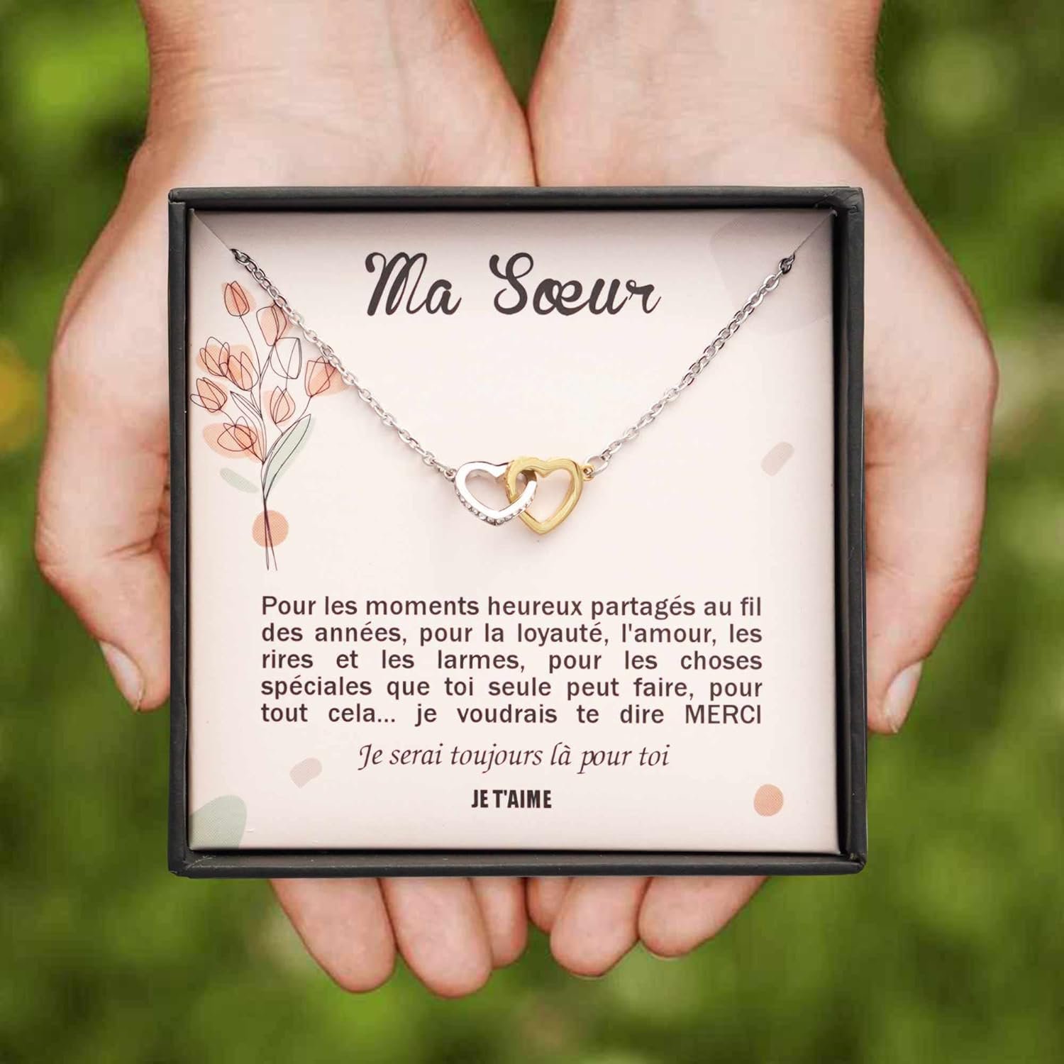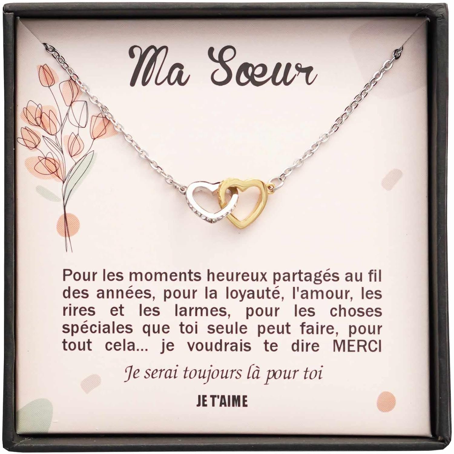 Ce collier est livré dans une boite à bijoux contenant un message personnalisé destiné à votre soeur.