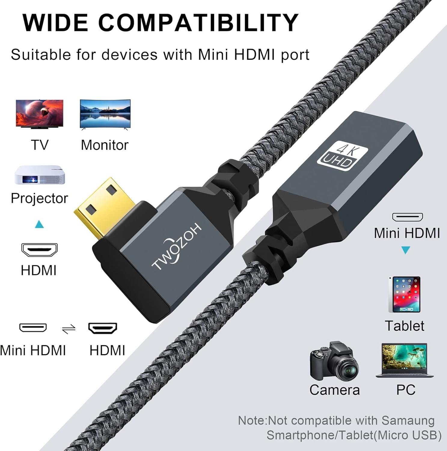 Twozoh Câble Adaptateur Mini HDMI vers HDMI 0,2M, Nylon tressé à 90 Degrés à angle droit Mâle Mini HDMI vers Femelle HDMI Câble extension Supporte 3D/4K 1080p