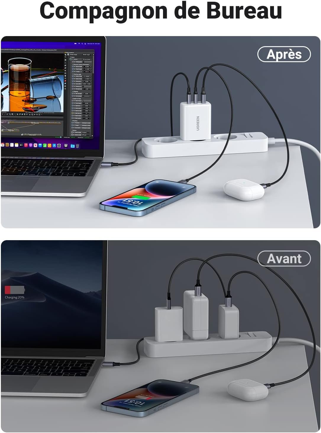 Ce chargeur rapide prend en charge les protocoles de charge PD 3.0, PPS et QC, pour une recharge rapide et sûre. Il est compatible avec une large gamme d’appareils, notamment les iPhone, Galaxy, Pixel, MacBook Air et Pro, ainsi que les tablettes et ordinateurs portables. Avec sa puissance maximale de 65W, il recharge votre MacBook Air 2020 à 66% en seulement 60 minutes.