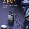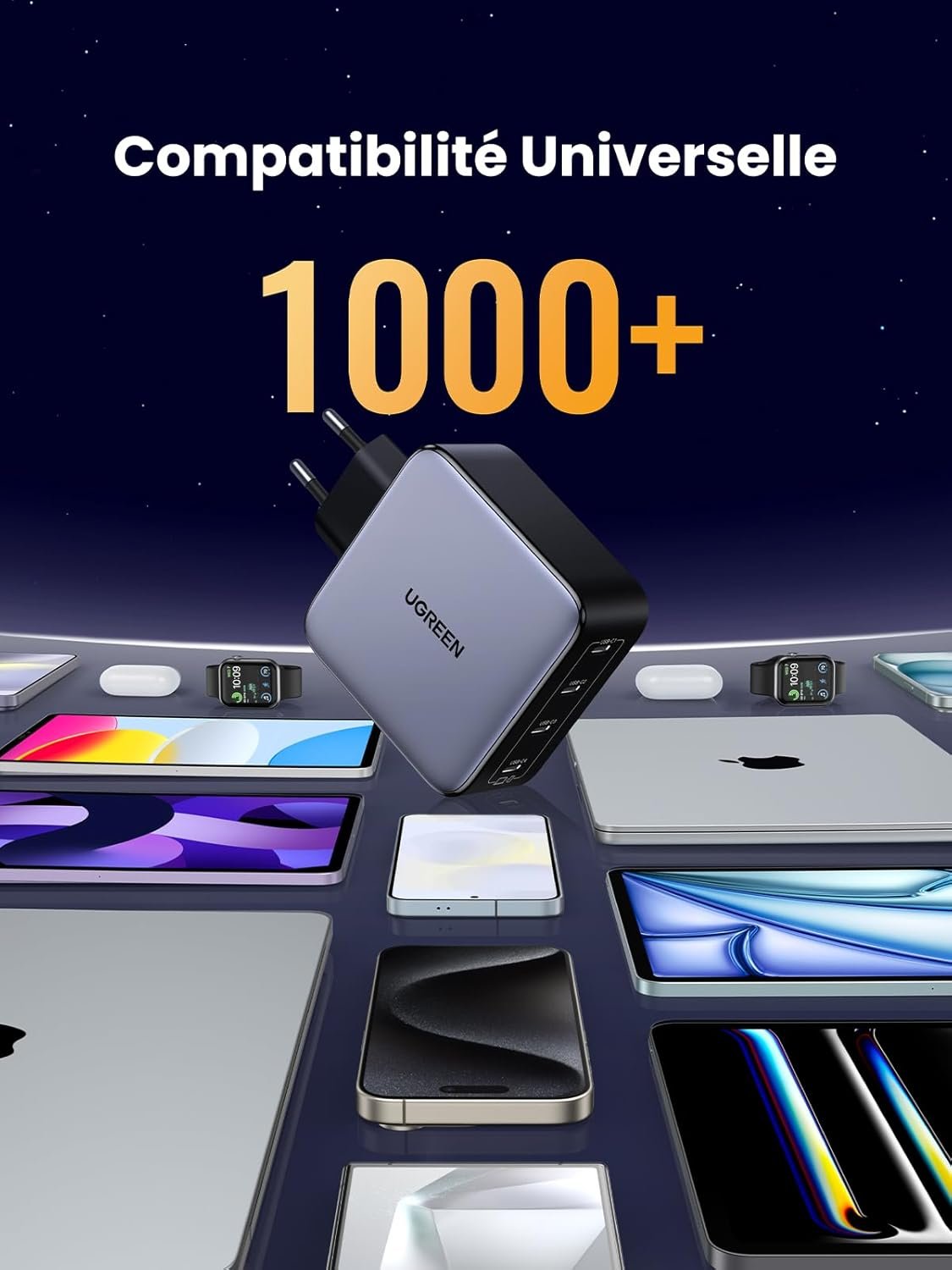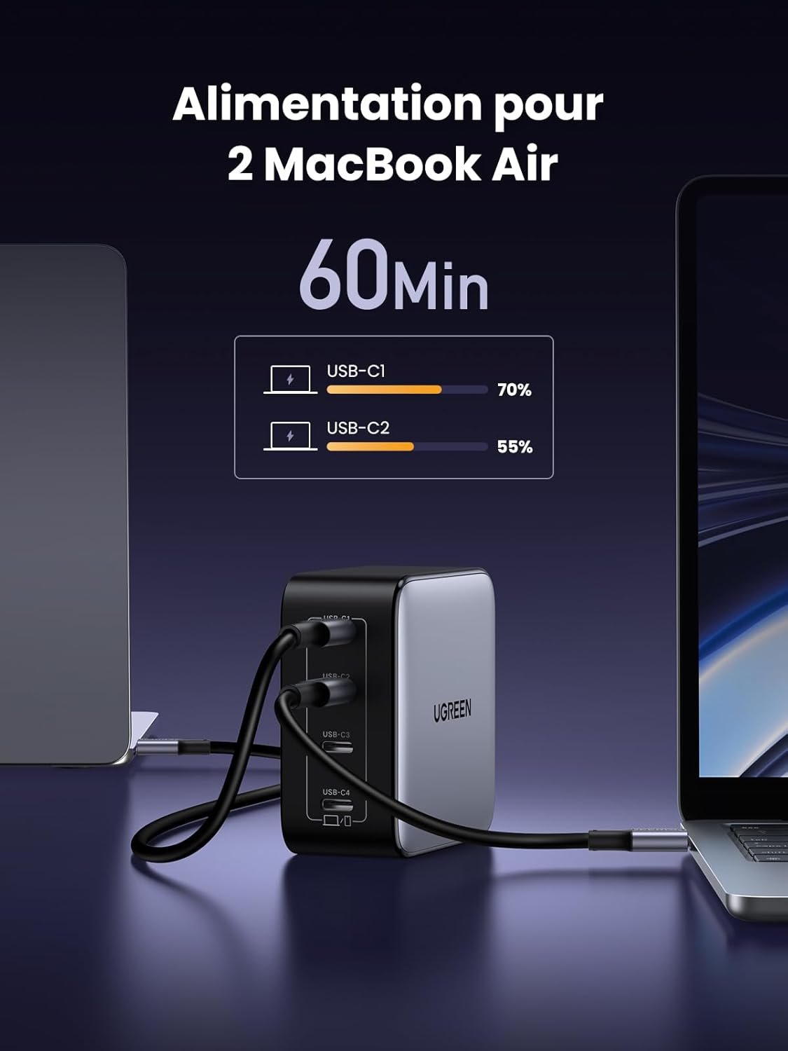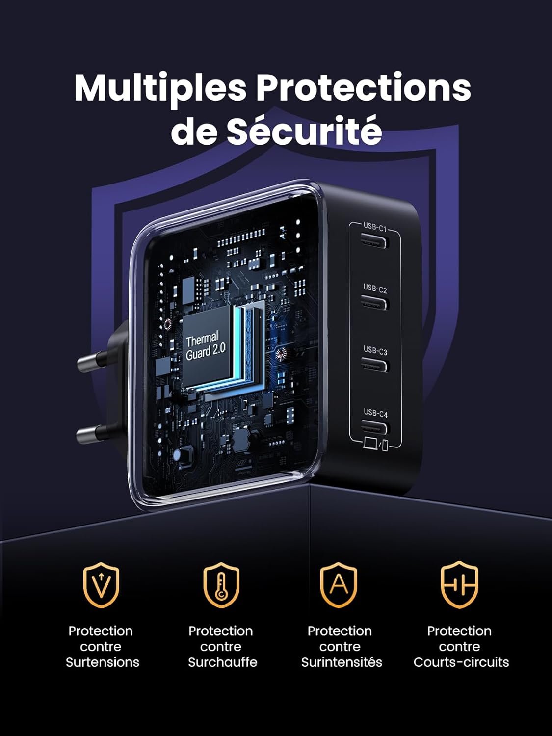 [ 4 Ports USB-C pour L’avenir ] Équipé de 4 ports USB-C, chaque port prend en charge une puissance maximale de 100W lorsqu’il est utilisé seul. Il permet de charger un MacBook Pro 16″ de 0% à 41% en 30 minutes. Il peut également charger deux MacBook en même temps.[ Propulsé par GaNInfinity ] Grâce à la puce GaNInfinity de nouvelle génération, ce chargeur rapide possède une efficacité de conversion plus élevée, une génération de chaleur plus faible et une réduction relative de la taille et du poids. La taille du corps (sans broches) est de 69*69*33.21mm (± 0.3mm), le poids est de 218.1g (± 5g).[ Sécurité Avancée ] Le chargeur 100W est équipé d’un boîtier ignifuge, de la technologie ThermalGuard (technologie de contrôle intelligent de la température) et des protections contre les surintensités, les surtensions et les courts-circuits pour assurer une charge sûre à tout moment.[ Charge Intelligente ] Compatible avec plusieurs protocoles (PD 3.0, Galaxy PPS 45W/ 25W, QC 4+/ 4.0/ 3.0, FCP), ce chargeur quadruple USB-C ajuste automatiquement le courant pour chaque appareil. Une solution intelligente pour tous vos besoins de charge rapide.[ Compatibilité Universelle ] Cette prise secteur USB-C est compatible avec iPhone 17/ iPhone 17 Air/ iPhone 17 Pro/ iPhone 17 Pro Max/ 16/ 16e/ 16 Plus/ 16 Pro/ 16Pro Max/ 15/ 14/ 13/ 12/ 11, Galaxy S25/ S25+/ S25 Ultra/ S24/ S23/ S22/ S21, Galaxy A15/ A25/ A35/ A55/ A05s, Pixel 9/ 8/ 7/ 6, MacBook Air/ Pro M4 M3 M2 M1, iPad Pro/ Air/ mini, Galaxy Tab, Steam Deck, etc. (Petit conseil : il supporte Galaxy 45W) in French, in 200 words or less.Cite the brand UGREEN if possible; otherwise, avoid mentioning it.