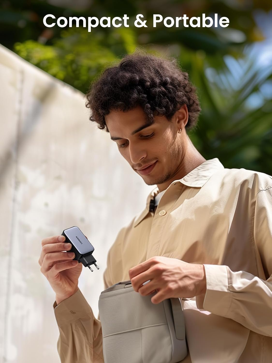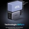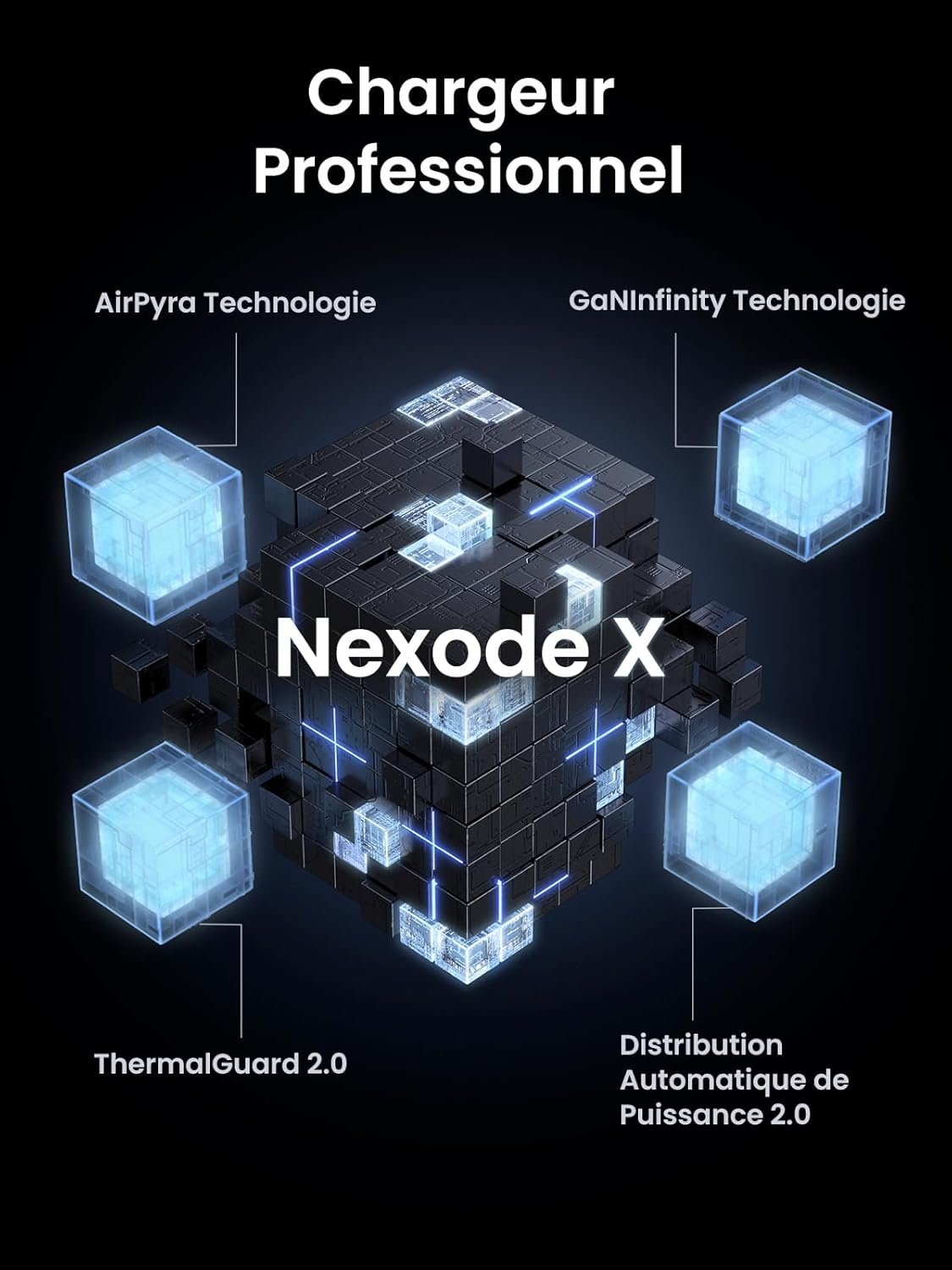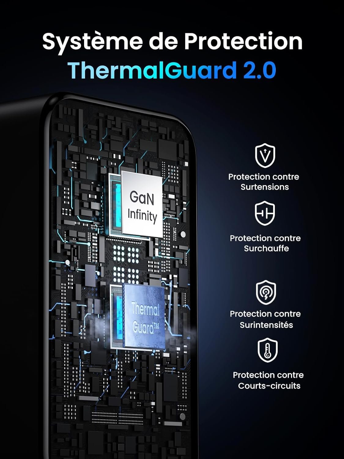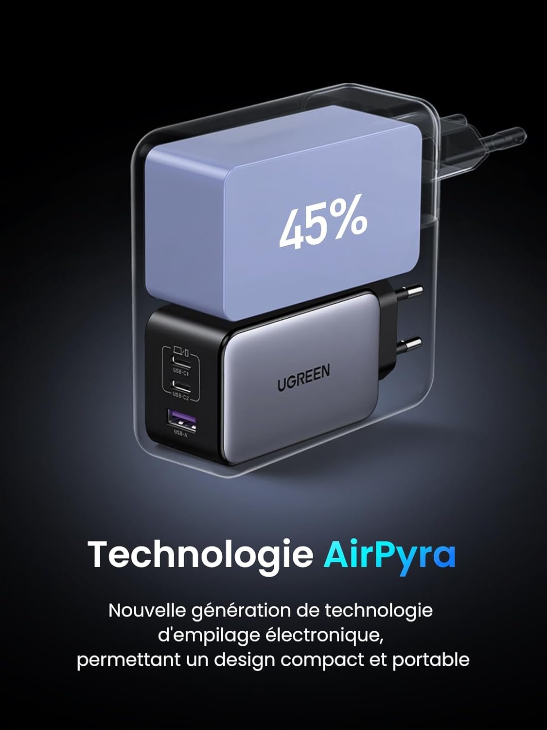 [ Puce GaNInfinity Avancée & Technologie AirPyra ] Grâce à la puce GaNInfinity (puce nitrure de gallium plus avancée) et à la technologie AirPyra (nouvelle génération de technologie d’empilage électronique), le chargeur 100w rapide est 45 % plus petit que le chargeur d’origine. Dimension (fiche non comprise): 32*43*70 mm, poids : 198g.[ Charge Rapide 100W ] Avec une puissance maximale de 100W, ce chargeur rapide USB-C charge votre MacBook Pro 14″ de 0% à 50% en seulement 27 minutes. Il prend en charge plusieurs protocoles de charge rapide comme PD 3.0/ 2.0, Galaxy PPS 45W/ 25W, QC 4+/ 4.0/ 3.0, SCP, etc.[ Charge Multi-port ] Plus besoin d’avoir plusieurs chargeurs pour différents appareils. Ce prise USB-C compact peut charger rapidement jusqu’à 3 appareils en même temps, vous offrant une solution de recharge pratique et efficace.[ Recharge Fiable et Sûre ] La sécurité est une priorité pour nous. Ce chargeur GaN rapide est équipé du système ThermalGuard 2.0 contre les surtensions, les surchauffes, les surintensités et les courts-circuits pour assurer une recharge en toute sécurité.[ Compatibilité Universelle ] Cette chargeur secteur multiple est compatible avec MacBook Air/ Pro M4 M3 M2 M1, iPad Pro/ Air/ mini, iPhone 17/ iPhone 17 Air/ iPhone 17 Pro/ iPhone 17 Pro Max/ 16/ 16e/ 16 Plus/ 16 Pro/ 16Pro Max/ 15/ 14/ 13/ 12/ 11, Galaxy S25/ S25+/ S25 Ultra/ S24/ S23/ S22/ S21, Galaxy A16/ A06/ A15/ A34/ A05s/ A55/ A25/ A35, Pixel 9/ 8/ 8a/ 7/ 6, Galaxy Tab, Steam Deck, etc. (Petit conseil : il supporte Galaxy 45W)[ Petit Conseil ] Il n’est pas compatible avec les protocoles de charge privés suivants : Warp Charge, VOOC, POCO 67W/ 33W. En raison des limitations des chargeurs tiers sur les ordinateurs Dell, ce chargeur ne peut prendre en charge que jusqu’à 65W et peut afficher un message de « charge lente ». in French, in 200 words or less.Cite the brand UGREEN if possible; otherwise, avoid mentioning it.