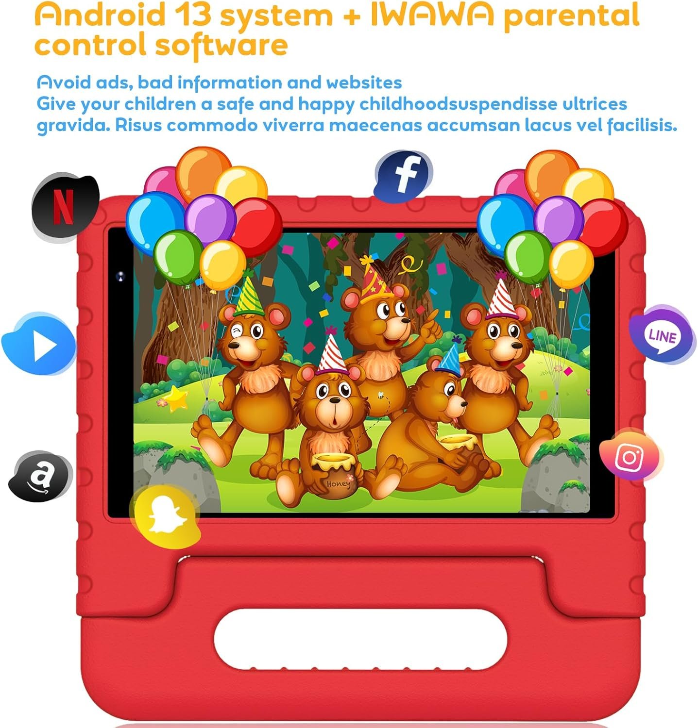 【𝟕 𝐆𝐨 𝐑𝐀𝐌 + 𝟔𝟒 𝐆𝐨 𝐑𝐎𝐌, 𝐄𝐱𝐭𝐞𝐧𝐬𝐢𝐛𝐥𝐞 𝐣𝐮𝐬𝐪𝐮’à 𝟏 𝐓𝐨】X9 tablette enfants dispose de 7GB ( 3GB physical + 4GB virtual ) RAM et 64GB ROM de stockage interne. Elle prend en charge une carte micro SD d’une capacité maximale de 1 To (non fournie). Elle peut donc stocker un grand nombre de livres électroniques, de films, de photos et bien plus encore. Il est certifié et vous pouvez télécharger les applications nécessaires à partir du Play Store: Disney+, Youtube, Netflix et plus encore. 【É𝐜𝐫𝐚𝐧 𝐈𝐏𝐒 𝐝𝐞 𝟖 𝐏𝐨𝐮𝐜𝐞𝐬 + 𝐃𝐨𝐮𝐛𝐥𝐞 𝐂𝐚𝐦é𝐫𝐚】La tablette enfants educative X9 est dotée d’un écran IPS large et époustouflant de 1280*800 qui offre une qualité d’image plus fine, plus riche et plus lumineuse sous tous les angles. Les caméras avant de 2 MP et arrière de 5 MP facilitent les appels vidéo, l’apprentissage en ligne, etc. La tablette X9 a une résolution d’écran supérieure à celle des tablettes de 7 pouces, et même la même résolution que les tablettes de 10 pouces plus chères. 【𝐒𝐲𝐬𝐭è𝐦𝐞 𝐀𝐧𝐝𝐫𝐨𝐢𝐝 𝟏𝟑 + 𝐏𝐞𝐫𝐟𝐨𝐫𝐦𝐚𝐧𝐜𝐞𝐬 𝐄𝐱𝐜𝐞𝐩𝐭𝐢𝐨𝐧𝐧𝐞𝐥𝐥𝐞𝐬】La tablette enfants avec wifi est équipée du dernier système d’exploitation Android, qui offre un environnement plus sûr et une expérience plus intelligente. Par exemple, elle prend en charge les contrôles parentaux avancés, les widgets et le mode d’économie d’énergie intelligent. Le CPU quadricoeur intégré de 1,5 GHz permet un lancement rapide des applications et une expérience de streaming fluide. Ses puissantes performances en font le cadeau idéal pour les enfants. 【𝐄𝐭𝐮𝐢 𝐄𝐕𝐀 𝐏𝐨𝐮𝐫 𝐓𝐚𝐛𝐥𝐞𝐭𝐭𝐞 + 𝐑𝐨𝐭𝐚𝐭𝐢𝐟 𝐀𝐧𝐭𝐢𝐜𝐡𝐨𝐜】L’étui antichoc de la Tablette enfants X9 est fabriqué en matériau EVA écologique de haute qualité, offrant une protection parfaite contre les chutes accidentelles, les rayures, les chocs et la poussière, livré avec un film protecteur d’écran pour éviter les rayures de l’écran. Le support rotatif et pliable offre des angles multiples pour un confort maximal pour votre enfant, qu’il regarde des vidéos ou qu’il soit tenu à la main et transporté en déplacement. 【𝐖𝐢𝐅𝐢 𝟔, 𝐁𝐥𝐮𝐞𝐭𝐨𝐨𝐭𝐡 𝟓.𝟎, 𝐆𝐏𝐒 + 𝐒𝐞𝐫𝐯𝐢𝐜𝐞𝐬 𝐏𝐫𝐨𝐟𝐞𝐬𝐬𝐢𝐨𝐧𝐧𝐞𝐥𝐬】Nous offrons une garantie de 24 mois sans souci et un service clientèle amical. Si vous avez des questions, n’hésitez pas à nous laisser un message et nous répondrons et fournirons un support technique dès que possible. Cette tablette prend également en charge le GPS, le mode de protection des yeux, la connectivité Bluetooth 5.0 et Wi-Fi 6, etc. C’est un cadeau parfait pour votre famille, vos amis et vos proches.